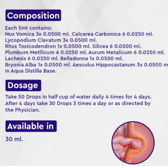 Nux Vomica 3x 0.0500 ml. Calcarea Carbonica 6 0.0250 ml. Lycopodium Clavatum 3x 0.0500 ml. Rhus Toxicodendron 1x 0.0500 ml. Silicea 6 0.0500 ml. Plumbum Metllicum 6 0.0250 ml. Aurum Metalicum 6 0.0250 ml., Lachesis 6 0.0250 ml. Belladonna 1x 0.0500 ml. Bryonia Alba 1x 0.0500 ml. Aesculus Hippocastanum 3x 0.0500 ml. In Aqua Distilla Base.