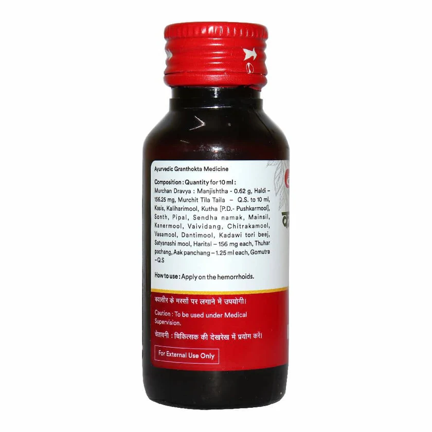 Kashisadi tel is a polyherbal medicated oil used for external application on Hemorrhoids, corn, and warts. It has antiseptic and disinfectant activities. Regular topical application helps in softening the hemorrhoids, corns, and warts and reduces their size.