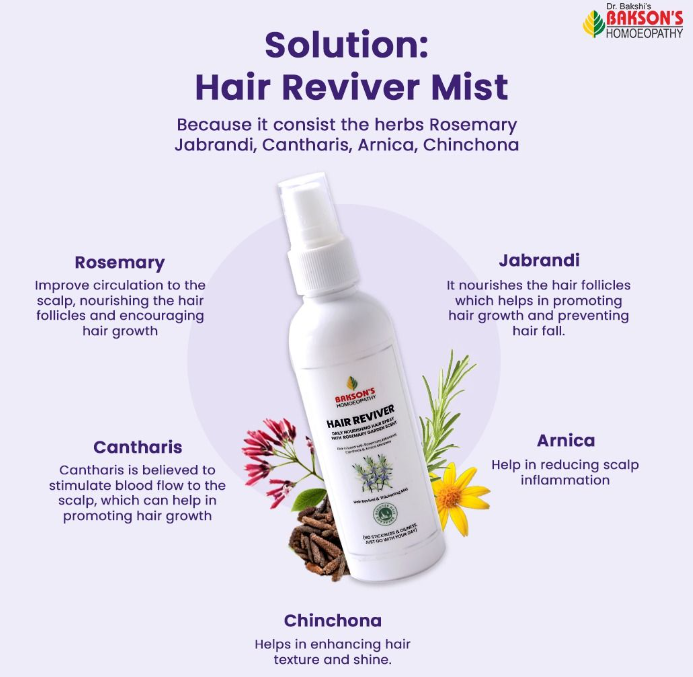 Hair loss is a frequent concern for both men and women. Bakson’s Hair Reviver is an excellent hair growth spray enriched with natural and scientifically researched herbs like Rosmarinus Officinalis, Jaborandi, Cantharis, Cinchona, and Arnica Montana. It is the ultimate hair fall control solution that not only prevents hair loss but also works magically as a hair growth spray. The main herb in this Hair Mist is Rosemary and it is scientifically proven that Rosemary is a culinary and healing herb. According to studies, rosemary oil has anti-inflammatory properties that promote nerve growth and improve blood circulation. Rosemary extract is a natural DTH blocker, it revitalizes and nourishes the hair follicles, resulting in hair growth. It is a daily nourishing hair regrowth spray that has been preventing hair loss in women and men. Apart from promoting hair growth, it is also good to deal with all hair problems like dandruff, dry or itchy scalp, postpartum hair loss, and premature hair greying.