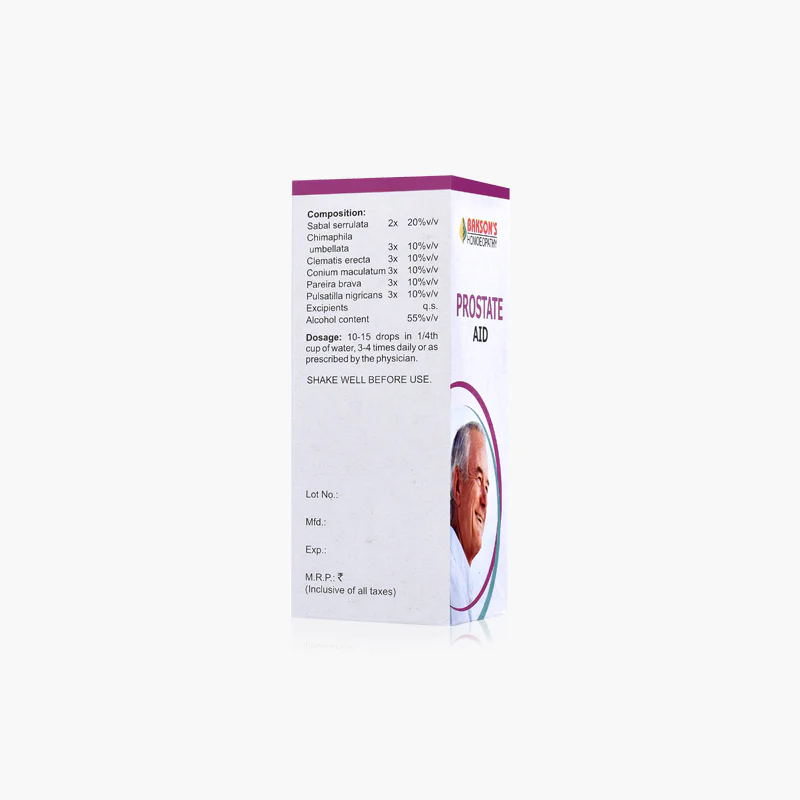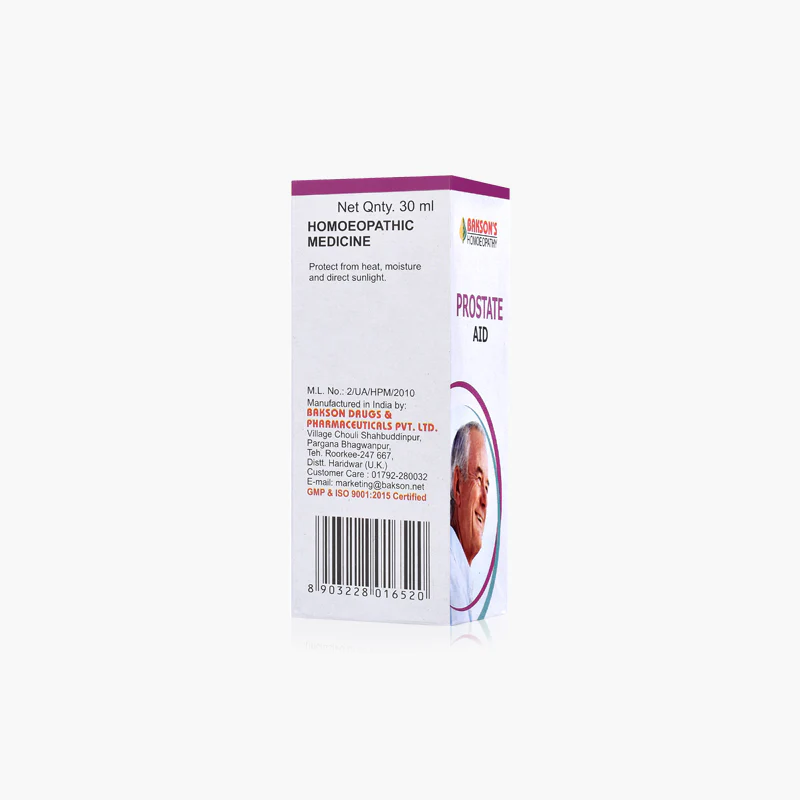 Bakson Prostate Aid Drops is a homeopathic medicine for urine problems. It is effective against symptoms such as increased frequency, hesitancy, urgency, burning & dribbling of urine with interrupted flow Hyperplasia, is a common condition that affects older men. Whenthe Prostate becomes enlarged, it can place pressure on the Bladder and Urethra, the tube through which urine passes. An enlarged Prostate can create difficulties with urination and weakens the Bladder. Prostate Aid can check the symptoms of Prostate enlargement, restoring the state of health without the need for surgical intervention. Bakson Prostate Aid Drops henceforth, relieves the frequency, urgency, hesitancy to urinate, dribbling of urine & its interrupted flow.
