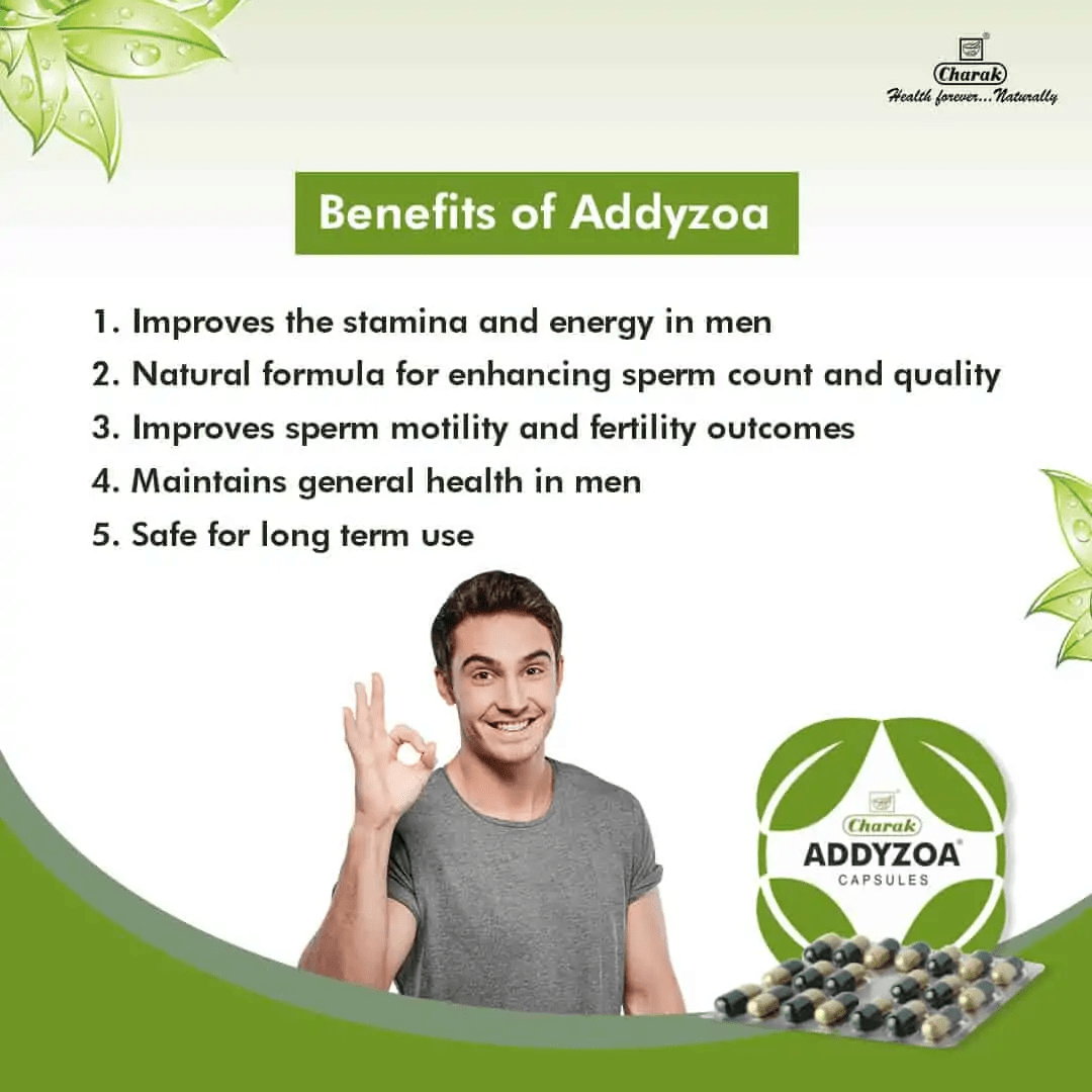 Addyzoa is a herbomineral formulation that helps maintain the health of sperm. Herbs like Gokshur, Ashwagandha help reduce excessive oxidative stress at the cellular level responsible for sperm damage and improve sperm quality and quantity.