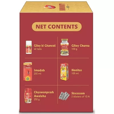 Dabur Immunity kit contains 6 different contents in it which helps increase the immunity and protect one's body from different kinds of diseases The kit contains Dabur Chyawanprash , Dabur Giloy Churna , Stresscom ,Dabur Imudab Syrup, Dabur Honitus Syrup , Dabur Giloy ki Ghanvati The contents of the kit are available in different formats and has certain properties which helps to improve immunity Its easy to consume. Usage Direction :Giloy Churna , Imudab Syrup, Honitus Syrup: 1/2 - 1 teaspoon twice daily, Giloy Ghanvati:- 1-2 Tablets twice daily Chyawanprash: 1-2 teaspoon twice daily with milk, Stresscom: 1 capsule twice daily