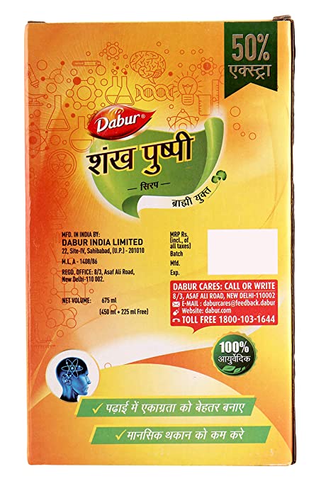 Dabur Shankhpushpi Syrup is a natural brain tonic and is also called medya rasayana. This ayurvedic medicine contains Brahmi and Shankhapushpi as the main ingredients. This is useful in improving concentration and learning. The regular intake of this medicine helps calm the mind and reduces anxiety, work related stress, and depression too. It is adaptogenic, antioxidant, anatacid and anti-hypertensive (mild effects). It is safe for people of any age, including children.