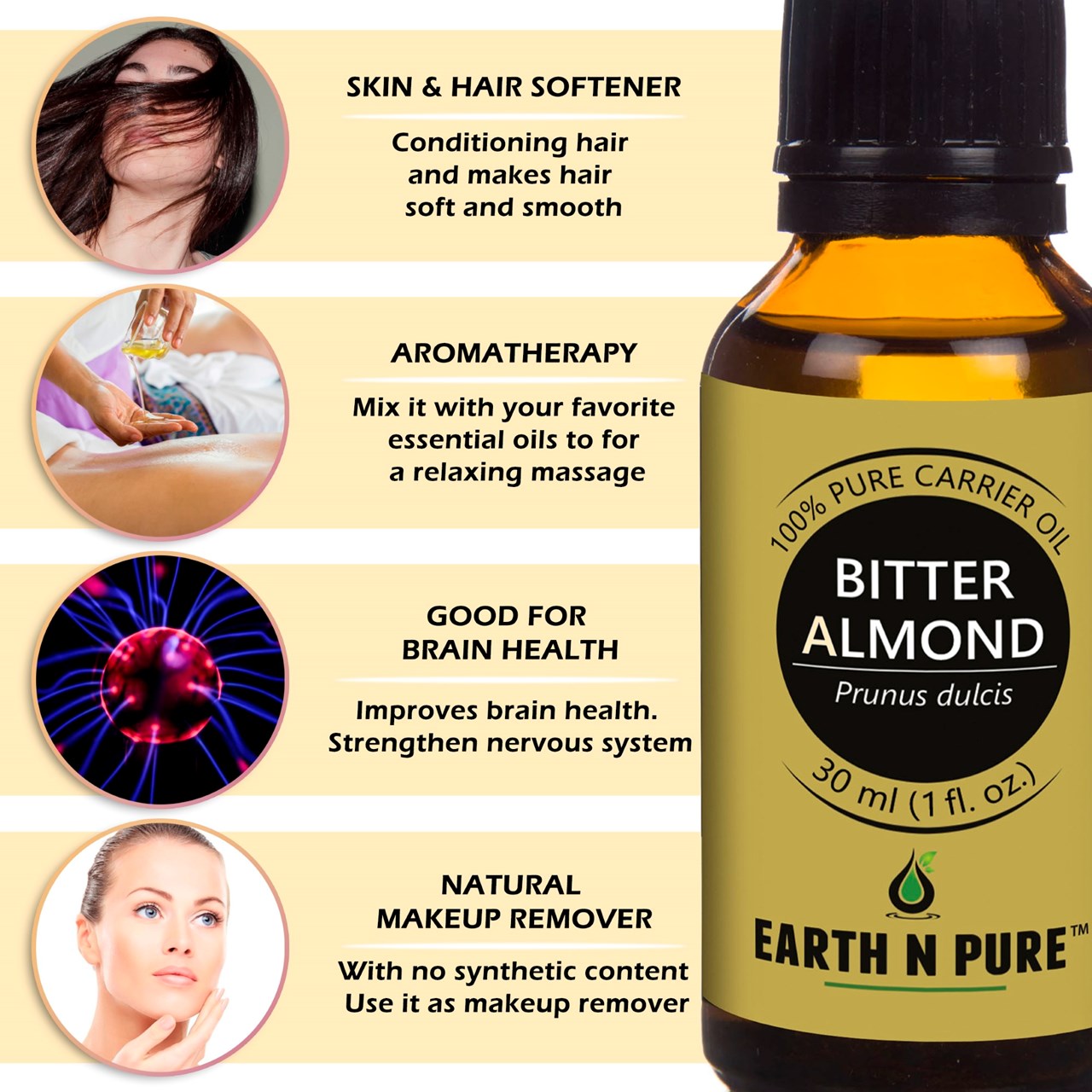 - BODYCARE WITH BITTER ALMOND OIL – Made with pure and undiluted Prunus dulcis, DIY is just the next step. Make your own beauty and well-being products with Bitter Almond Oil and other high quality ingredients from Earth N Pure. Discover recipes to create handmade soap, moisturizer, Bitter Almond Oil face wash, and other loveliness products.
