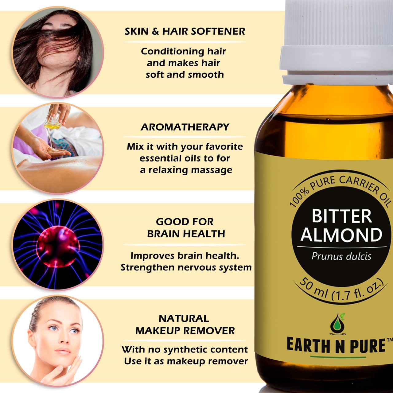 - BODYCARE WITH BITTER ALMOND OIL – Made with pure and undiluted Prunus dulcis, DIY is just the next step. Make your own beauty and well-being products with Bitter Almond Oil and other high quality ingredients from Earth N Pure. Discover recipes to create handmade soap, moisturizer, Bitter Almond Oil face wash, and other loveliness products.