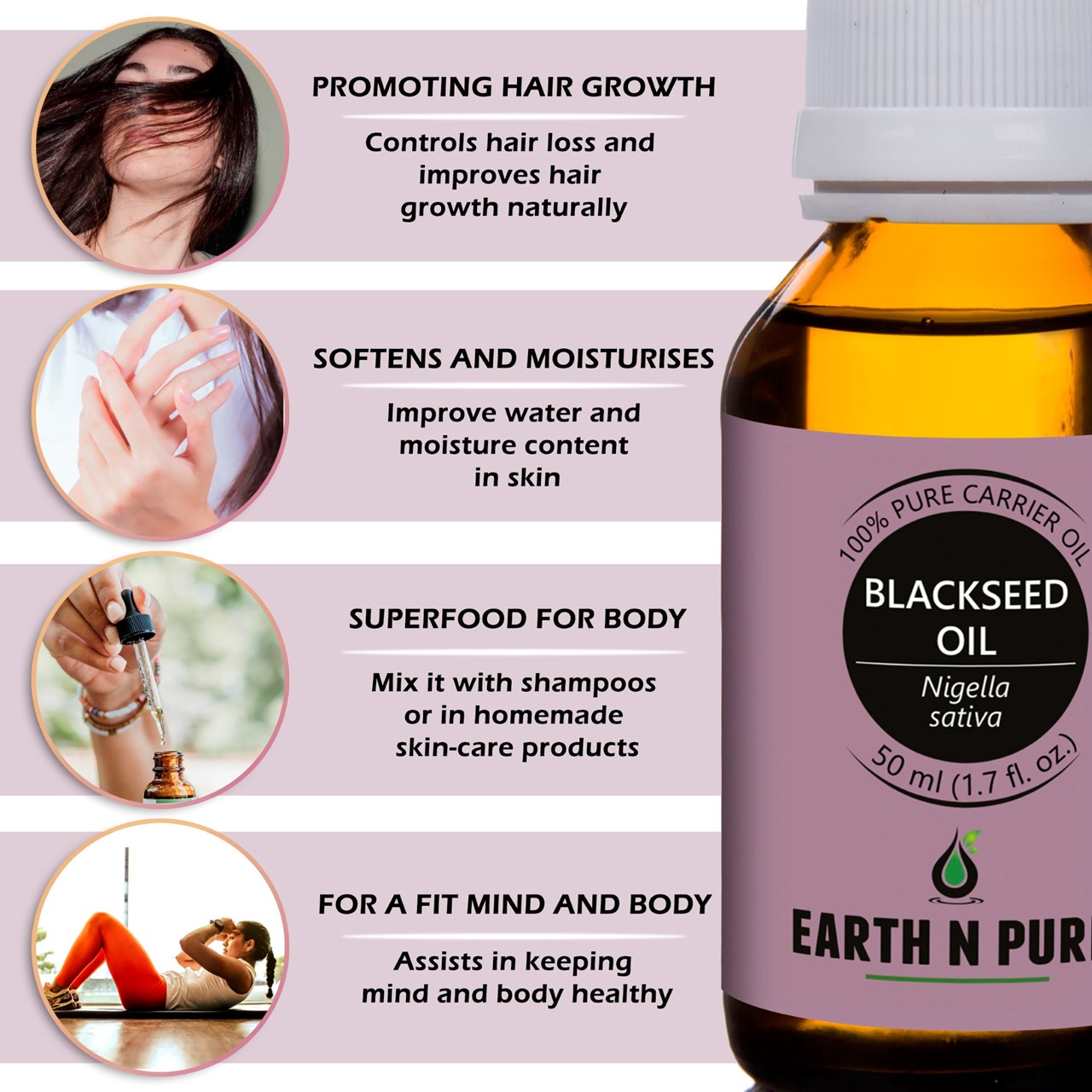 - BODYCARE WITH BLACKSEED OIL – Made with pure and undiluted Nigella sativa, DIY is just the next step. Make your own beauty and well-being products with Blackseed Oil and other high quality ingredients from Earth N Pure. Discover recipes to create handmade soap, moisturizer, Blackseed Oil face wash, and other loveliness products.