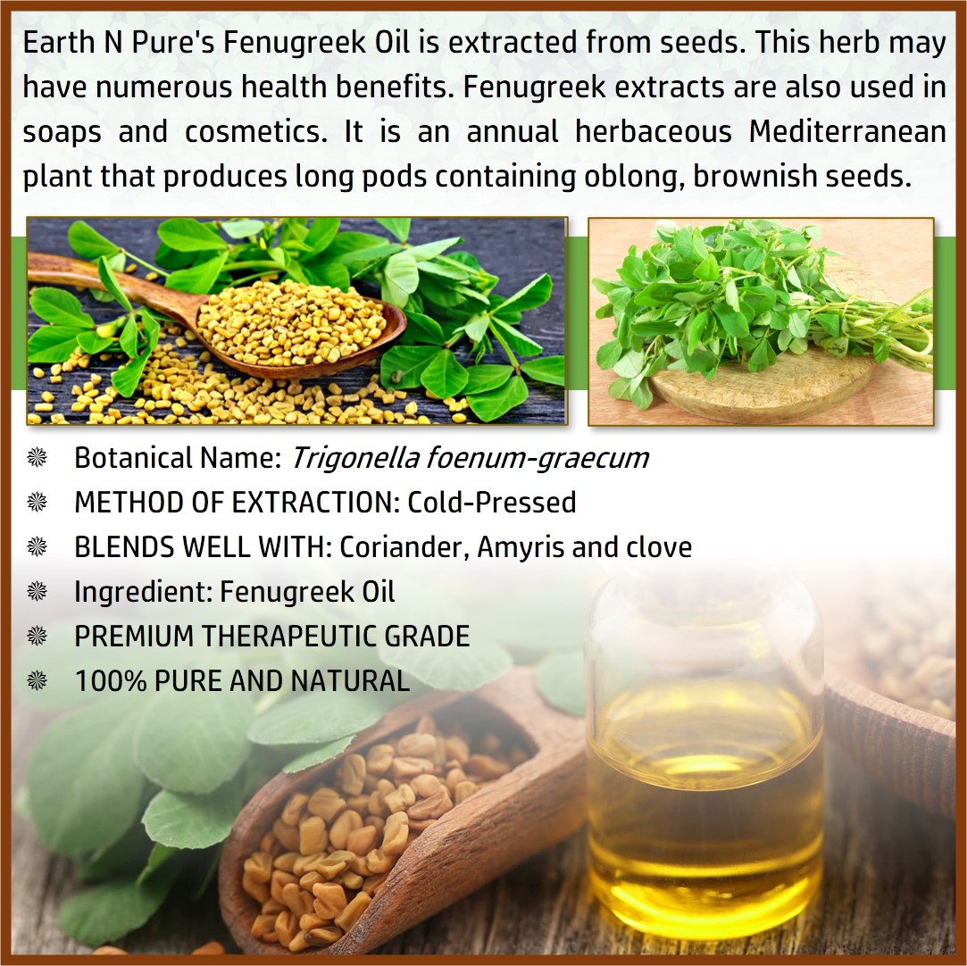 - CLEANER AND HIGH-QUALITY AFFORDABLE OILS: At Earth N Pure our goal is to positively impact the lives of as many people as we possibly can, by selling such a high quality product at an affordable price. Be sure while purchasing Earth N Pure Fenugreek Oil as it is physically refined thus made more stable for extended shelf life.