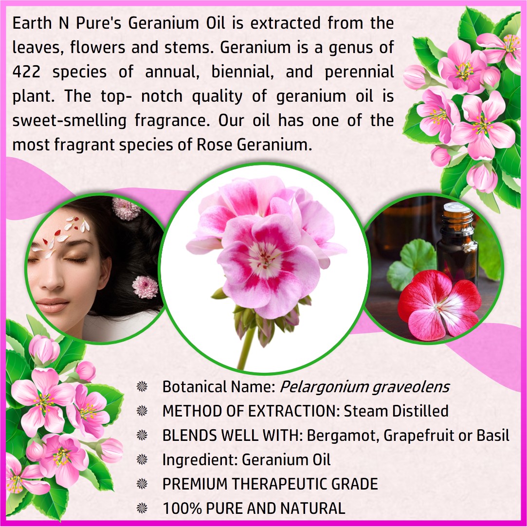 - CLEANER AND HIGH-QUALITY AFFORDABLE OILS: At Earth N Pure our goal is to positively impact the lives of as many people as we possibly can, by selling such a high quality product at an affordable price. Be sure while purchasing Earth N Pure Geranium Oil as it is physically refined thus made more stable for extended shelf life.