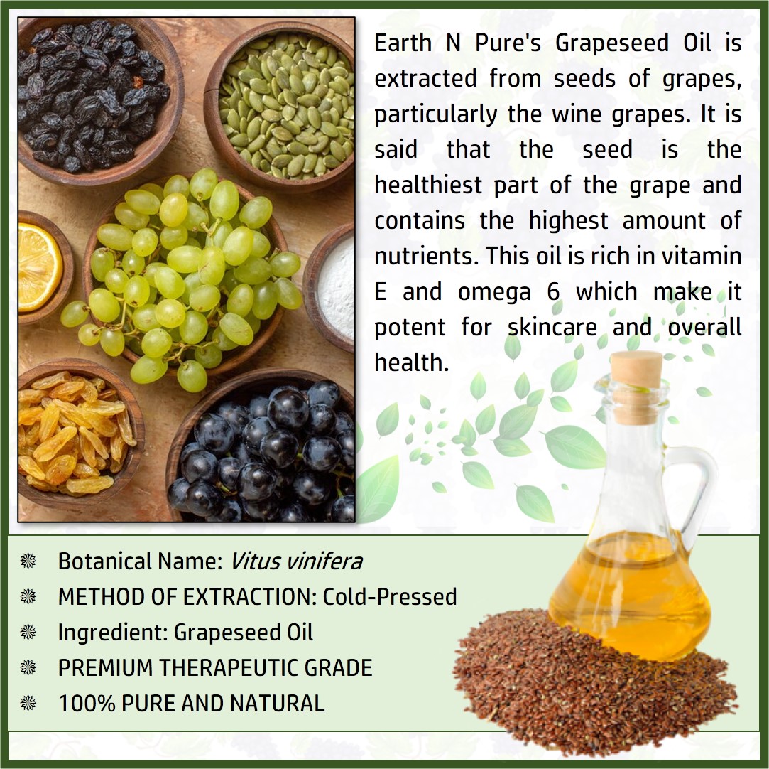 - CLEANER AND HIGH-QUALITY AFFORDABLE OILS: At Earth N Pure our goal is to positively impact the lives of as many people as we possibly can, by selling such a high quality product at an affordable price. Be sure while purchasing Earth N Pure Grapeseed Oil as it is physically refined thus made more stable for extended shelf life.