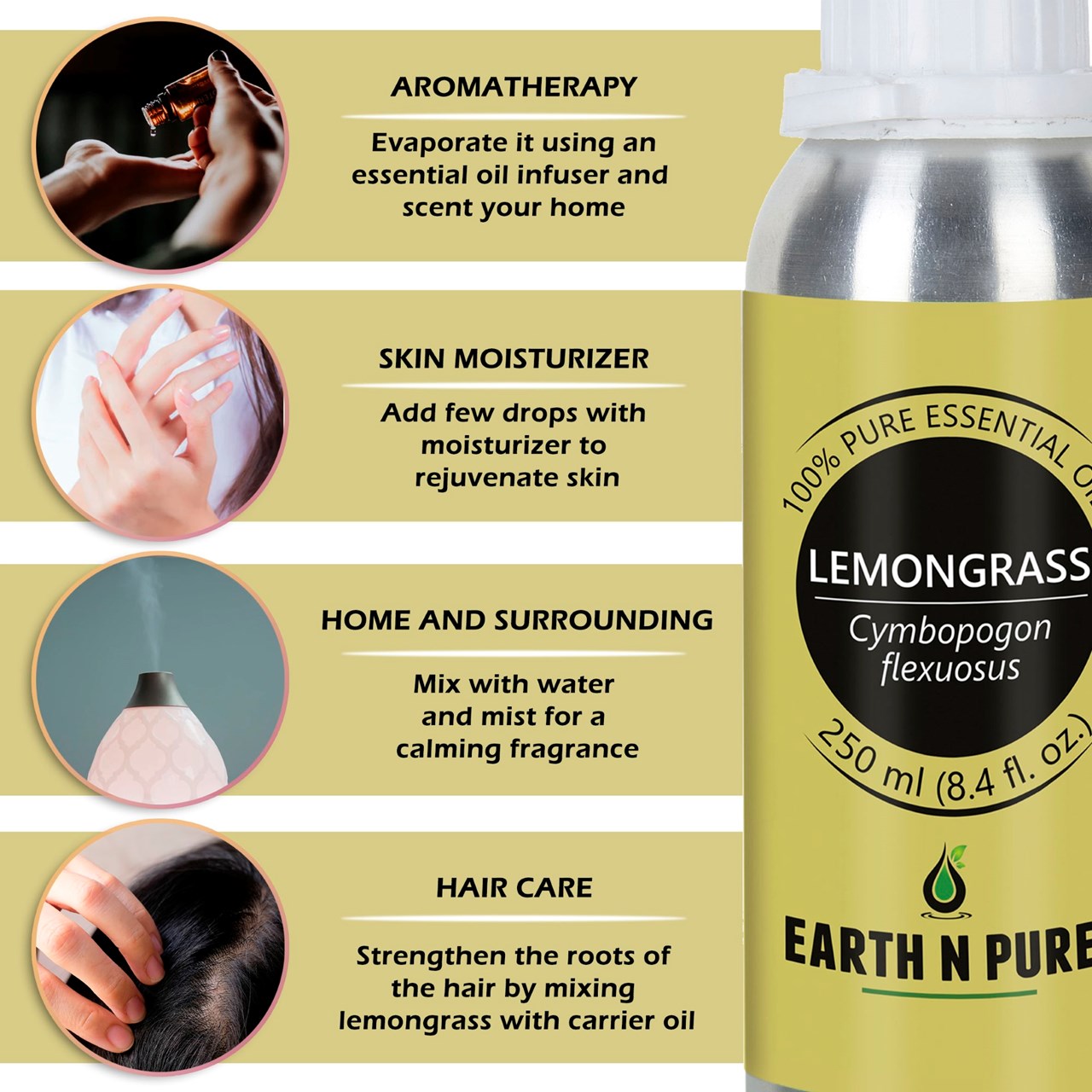 - CLEANER AND HIGH-QUALITY AFFORDABLE OILS: At Earth N Pure our goal is to positively impact the lives of as many people as we possibly can, by selling such a high quality product at an affordable price. Be sure while purchasing Earth N Pure Lemongrass Oil as it is physically refined thus made more stable for extended shelf life.