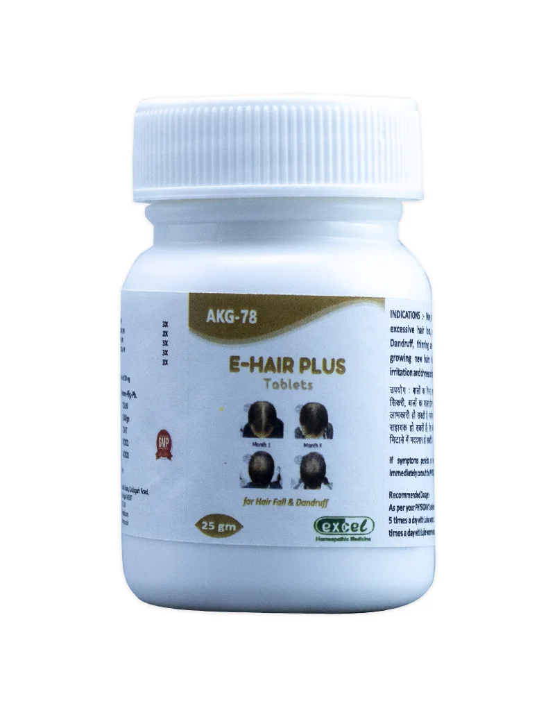 E-Hair Plus Tablets (AKG-78) may be effective in treating various hair problems, including premature hair loss, and baldness, male pattern baldness, female pattern baldness, premature greying of hairs, dry and split hairs, and more. It may also treat scalp-related issues like seborrheic dermatitis and help treat Alopecia areata.