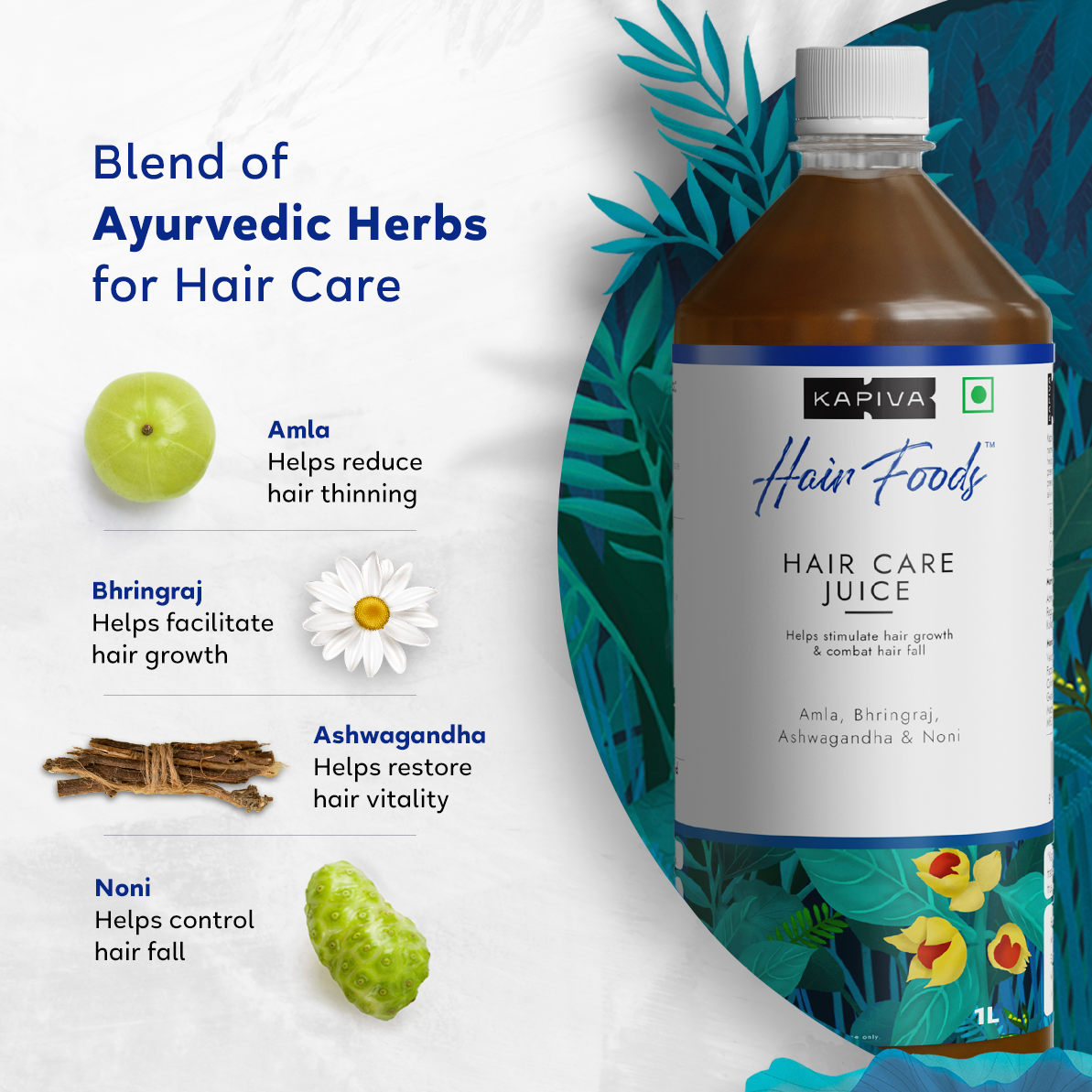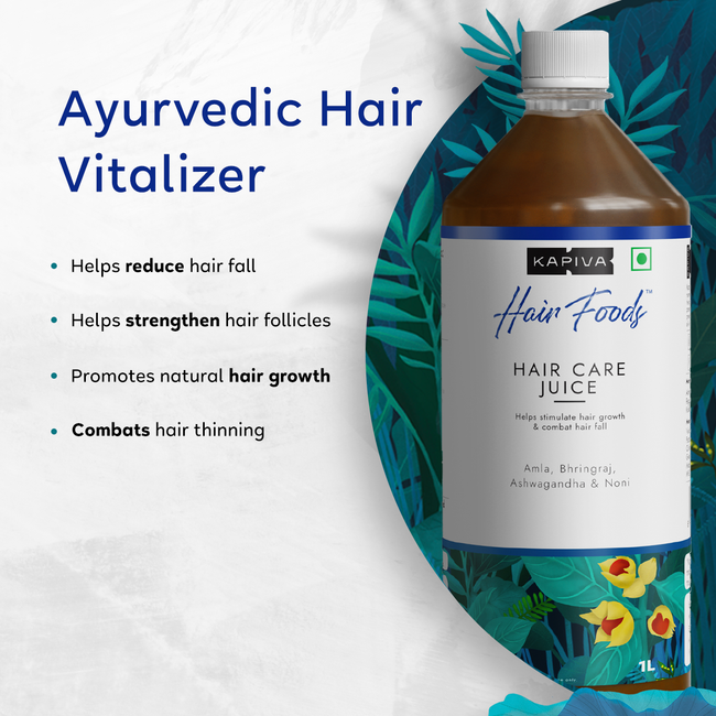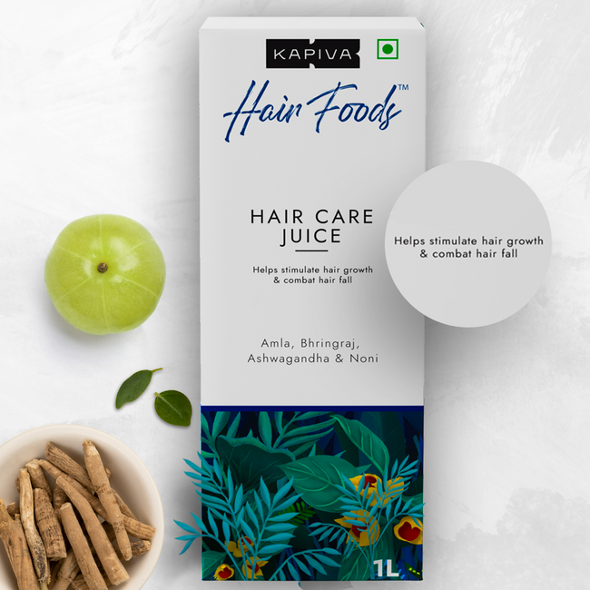 Kapiva Hair care juice helps boost scalp circulation, rejuvenate hair roots, and reduce breakage and hair fall from within.