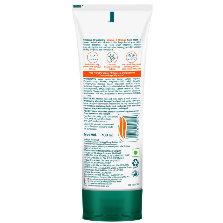 Moisten face and neck apply a small amount of Himalaya Brightening Vitamin C Orange Face Wash, and gently work up a lather using a circular motion. Wash off and pat dry. Use twice daily.