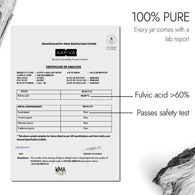 Kapiva Shilajit Resin fuels your body’s real energy source - ATP (Adenosine Triphosphate) helping you stay active, alert, and energized throughout the day. It has 60%+ Fulvic Acid and 80+ essential minerals like Calcium, Iron, Zinc, and Magnesium.