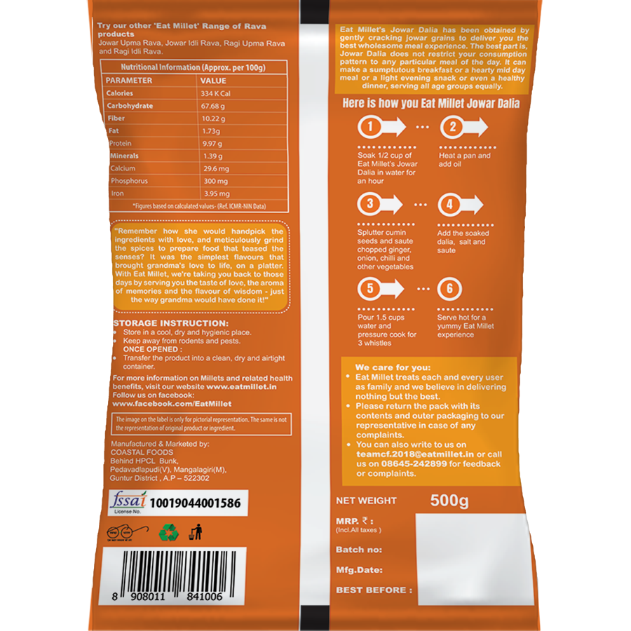 Eat Millet's Jowar Dalia has been obtained by gently cracking jowar grains to deliver you the best wholesome meal exprerience. The best part is,Jowar Dalia does not restrict yor consumption pattern to any particular meal of the day. It can make a sumptutous breakfast of a hearty mid day meal or a light evening snack of even a healthy dinner, serving all age groups equally.