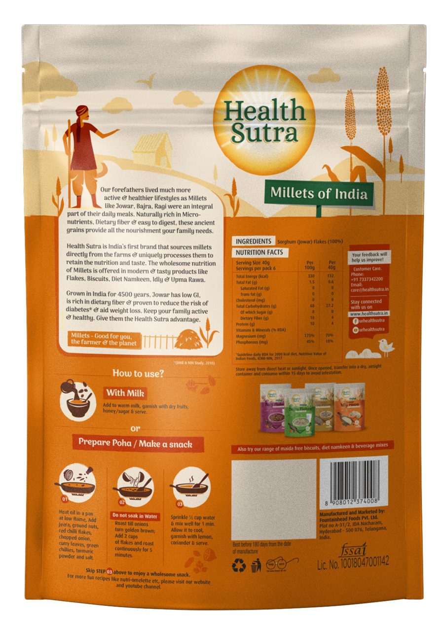 Highly nutritious breakfast cereal/flakes. Skip Oats/Cornflakes - Eat Millets Made from Sorghum Millet (Jowar). These Jowar flakes can be had with hot milk for breakfast and can be used to make Poha/Chiwda" "1. Add to warm milk. Add honey/sugar as necessary. Adding dry fruits optional 2. For Poha - Add seasoning grains and vegetables along with a Tbsp of oil to a kadai. Add Jowar Flakes after the vegetables are done. Sprinkle little water as necessary. Cook on Med. Flame with lid closed for 2 min. Add garnishing. Serve hot (Note: Don’t soak flakes in water)