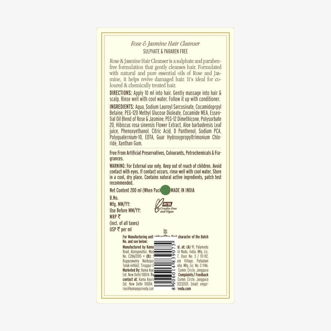 A perfectly safe mild natural hair cleanser free of SLES (Sulphates), Parabens, and Petrochemicals. Infused with powerful Ayurvedic ingredients that rebuild and revive dry, damaged hair. Vegetable source Soy protein binds moisture and improves hair's tensile strength and elasticity. Organic Aloe Vera Juice and Hibiscus Extract reduce hair loss, promote growth and hydrate deeply. Pure Essential oils of Rose and Jasmine protect hair health and vibrancy. Strengthens hair weakened by chemical processes, heat styling, and environmental exposure by gently restoring moisture. Cleanses hair and scalp effectively without stripping its natural oils, leaving it soft and shiny.