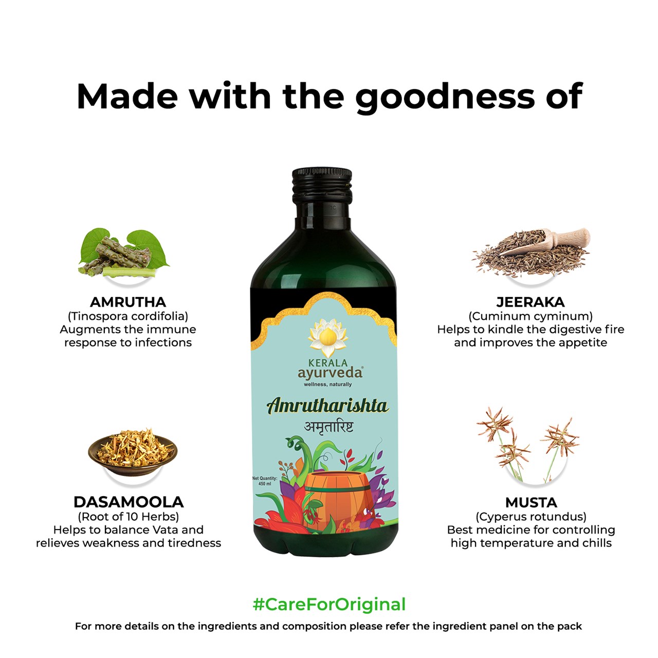 It is common for one to experience weakness, lack of appetite, and body pain after an illness. Our body requires time to remove all accumulated toxins altogether and recuperate. These accumulated toxins may delay natural healing by weakening the digestive fire, leading to protracted fatigue. Amrutha, an Ayurvedic herb meaning ‘heavenly elixir’ in Sanskrit, is a potent drug used to cleanse the body, enhance immunity, and expedite natural healing. Kerala Ayurveda Amrutharishta, with the goodness of Amrutha, is an ideal solution to relieve post-illness symptoms and strengthen your immunity. It has herbs like Root of ten herbs or Dasamoola, Giloy or Amrutha, Cumin or Jeeraka, Nutgrass or Musta, and Indian fumitory or Parpata that help restore energy levels and return to our routine quickly.