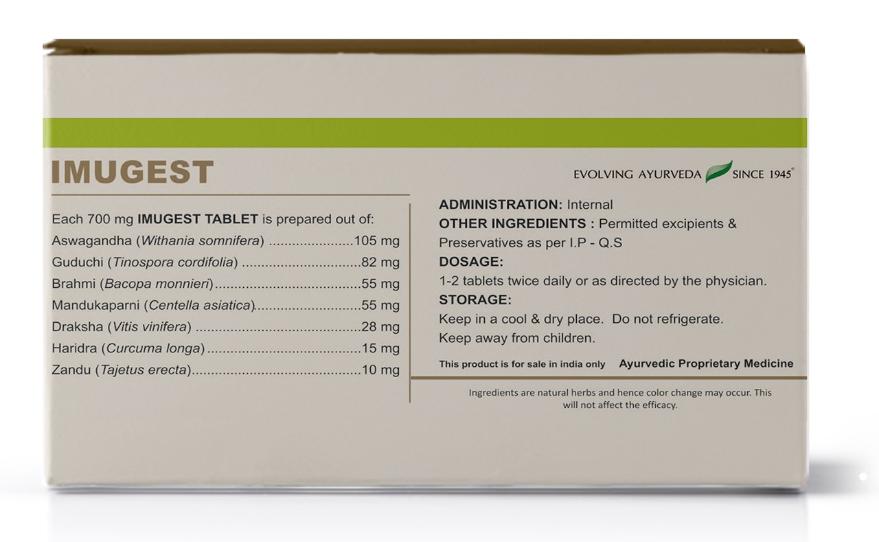 Kerala Ayurveda's Imugest Tablets, formulated to strengthen your body's defense system. These natural immunomodulator tablets are infused with the goodness of ojovardhaka herbs, known for their immune-boosting properties. By enhancing your body's natural defenses against infections, these tablets promote vitality and longevity and provide multi-level immunity support for overall wellness. These Ayurvedic tablets' antioxidant and antiviral properties support infection recovery and ensure long-term benefits. Don't let a weakened immune system hold you back. Choose Imugest Tablets, your ultimate solution for natural immune reinforcement.