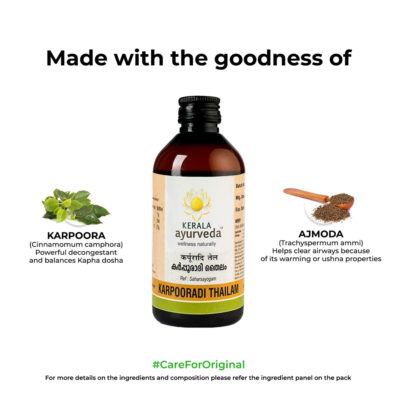 Kerala Ayurveda Karpooradi Thailam - the all-natural supplement that promotes overall well-being for you and your family. As the seasons change, many of us struggle with respiratory issues that can leave us drained and unwell. But with Karpooradi Thailam, you can soothe your nasal and chest congestion and breathe easy once again. Our warming chest rub oil is perfect for the whole family, including kids, and can be used alongside steam inhalation for maximum effectiveness. Our soothing chest rubbing oil is made with all-natural ingredients, carefully selected to provide the perfect balance of healing properties for your body, mind, and spirit. Don't let respiratory issues get in the way of your life. Choose Kerala Ayurveda Karpooradi Thailam and experience the benefits of holistic wellness and balance today. Try it now and feel the difference for yourself.