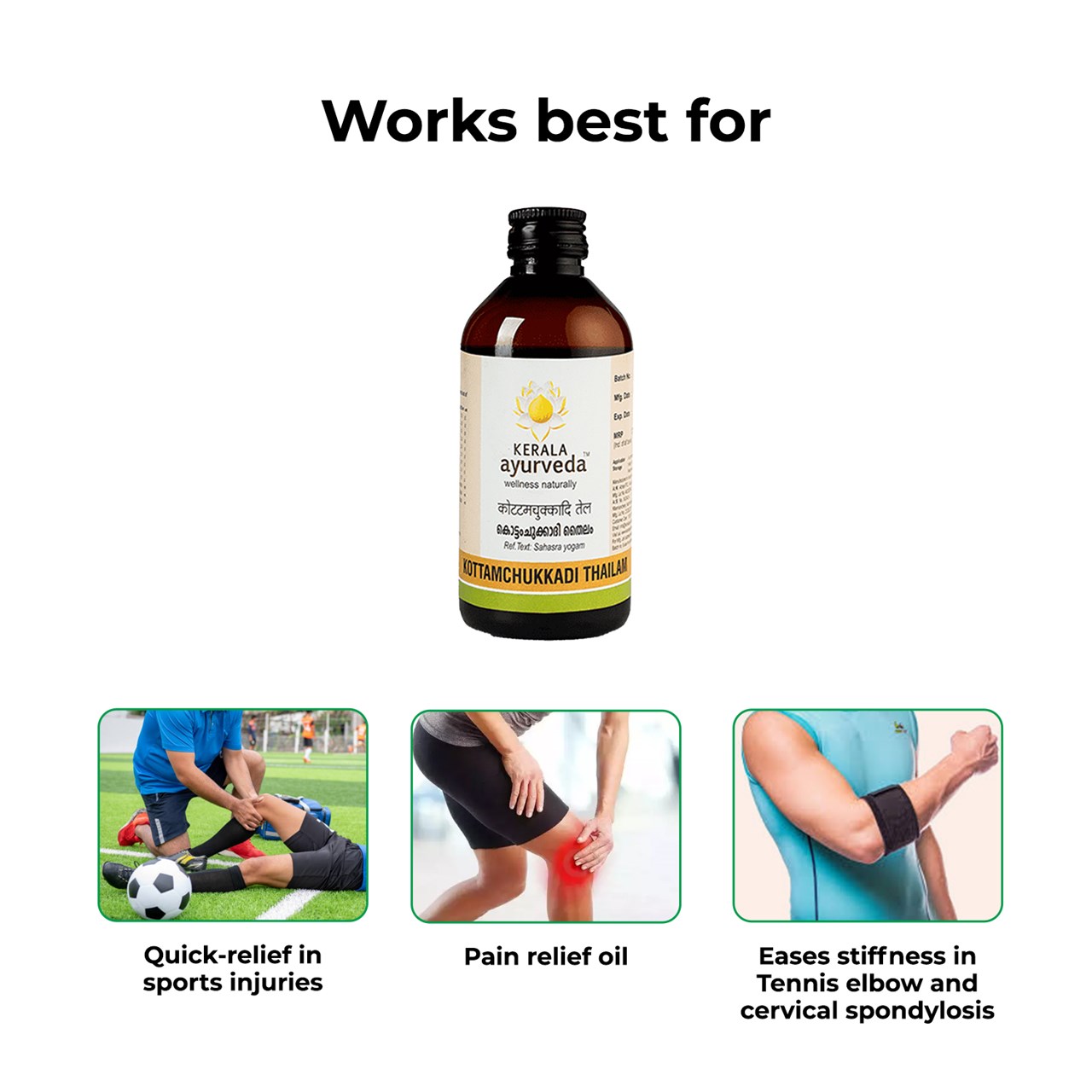 Kerala Ayurveda Kottamchukkadi Thailam ia an ancient Ayurvedic formula offers the perfect solution for anyone dealing with tennis elbow or other painful inflammatory conditions caused by repetitive wrist movements. It is also an excellent pain reliever for Cervical Spondylosis. We follow the original recipe from the ancient Ayurveda recipe book - Sahasrayogam - so you can trust that you're getting the real deal. Using Kottamchukkadi Thailam regularly can help you manage the symptoms of tennis elbow and other sports injuries, allowing you to play and enjoy life to the fullest, both physically and emotionally. Don't let pain hold you back any longer - try Kottamchukkadi Thailam and feel the difference.