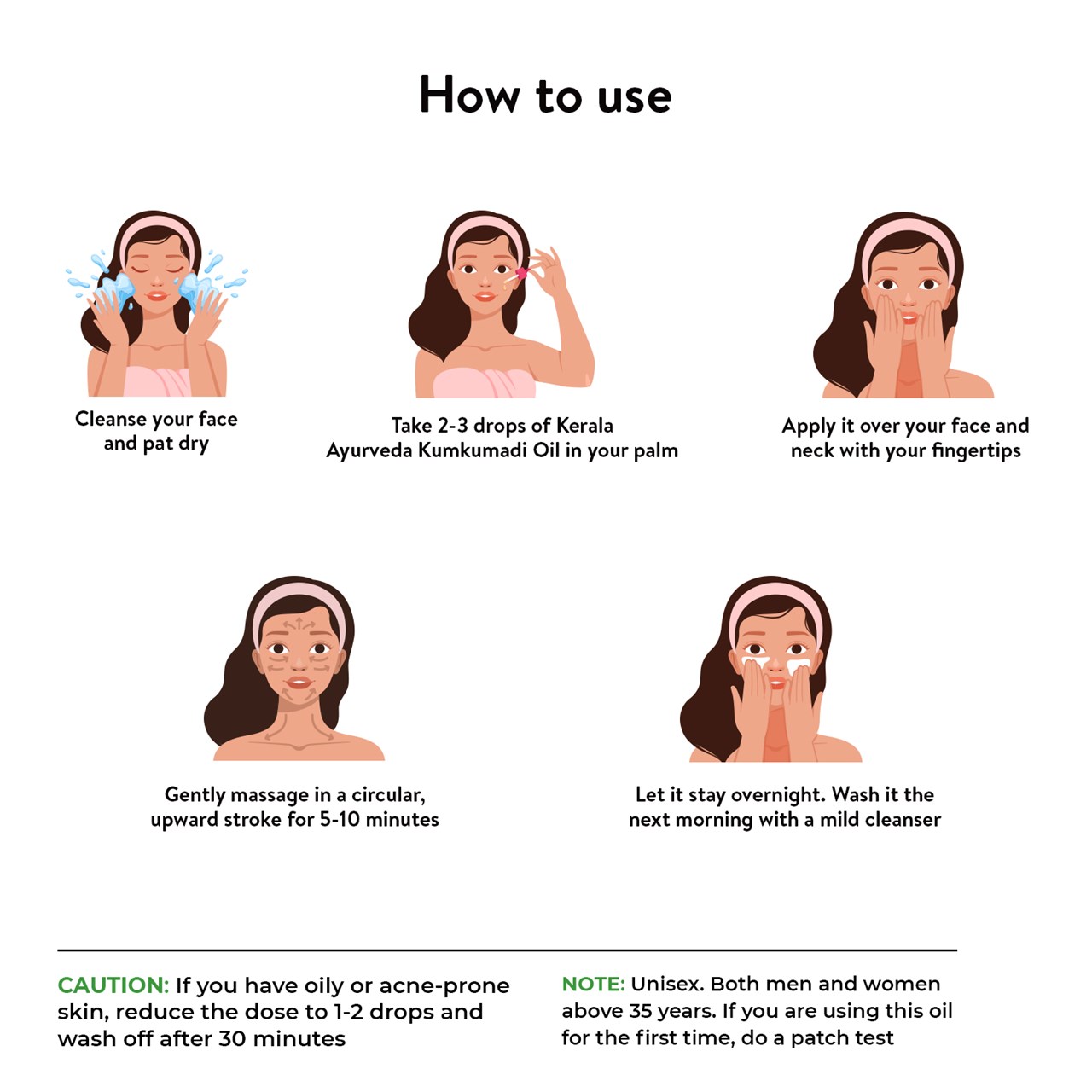 Shake the bottle well and take 2-3 drops of Kerala Ayurveda Kumkumadi Oil in your palm.