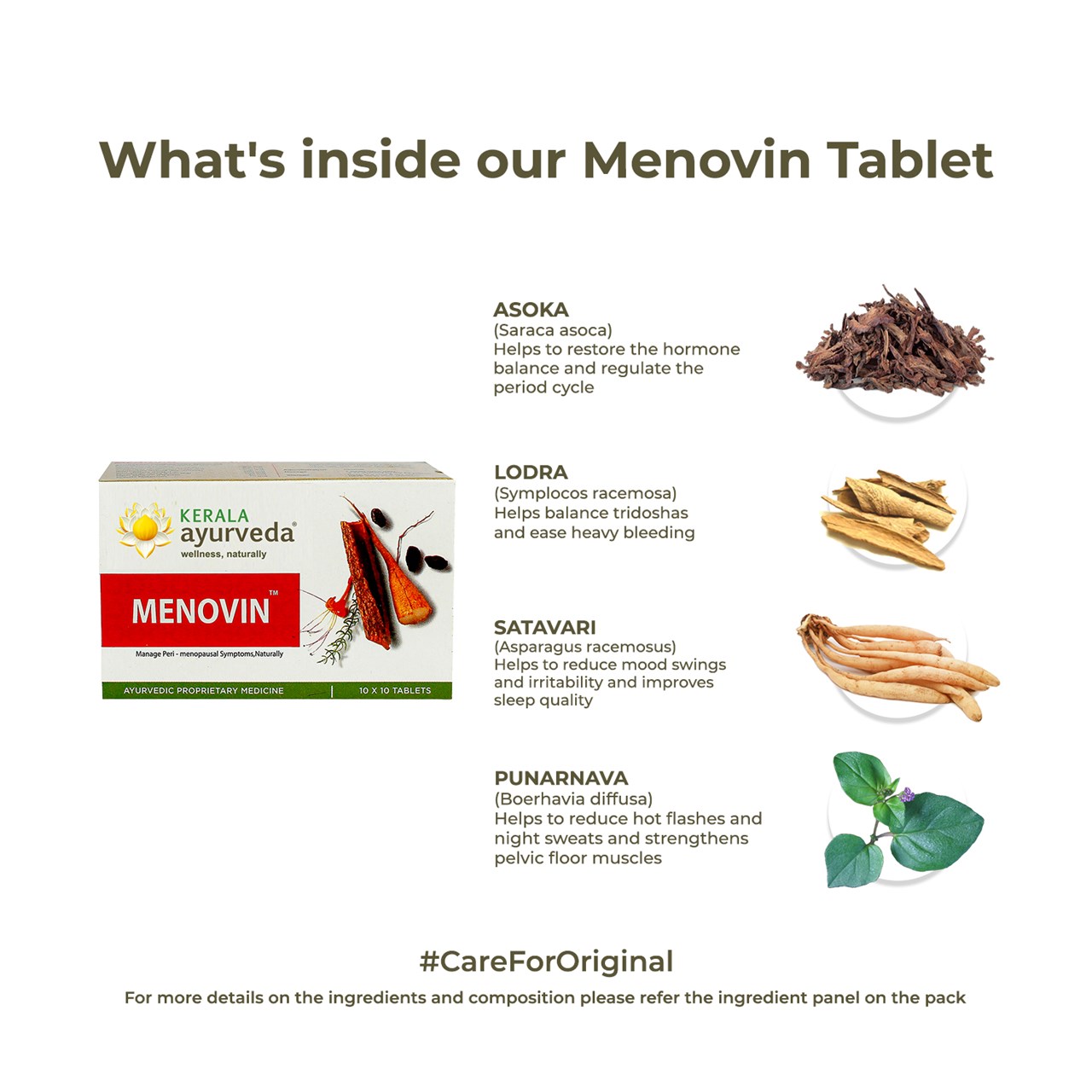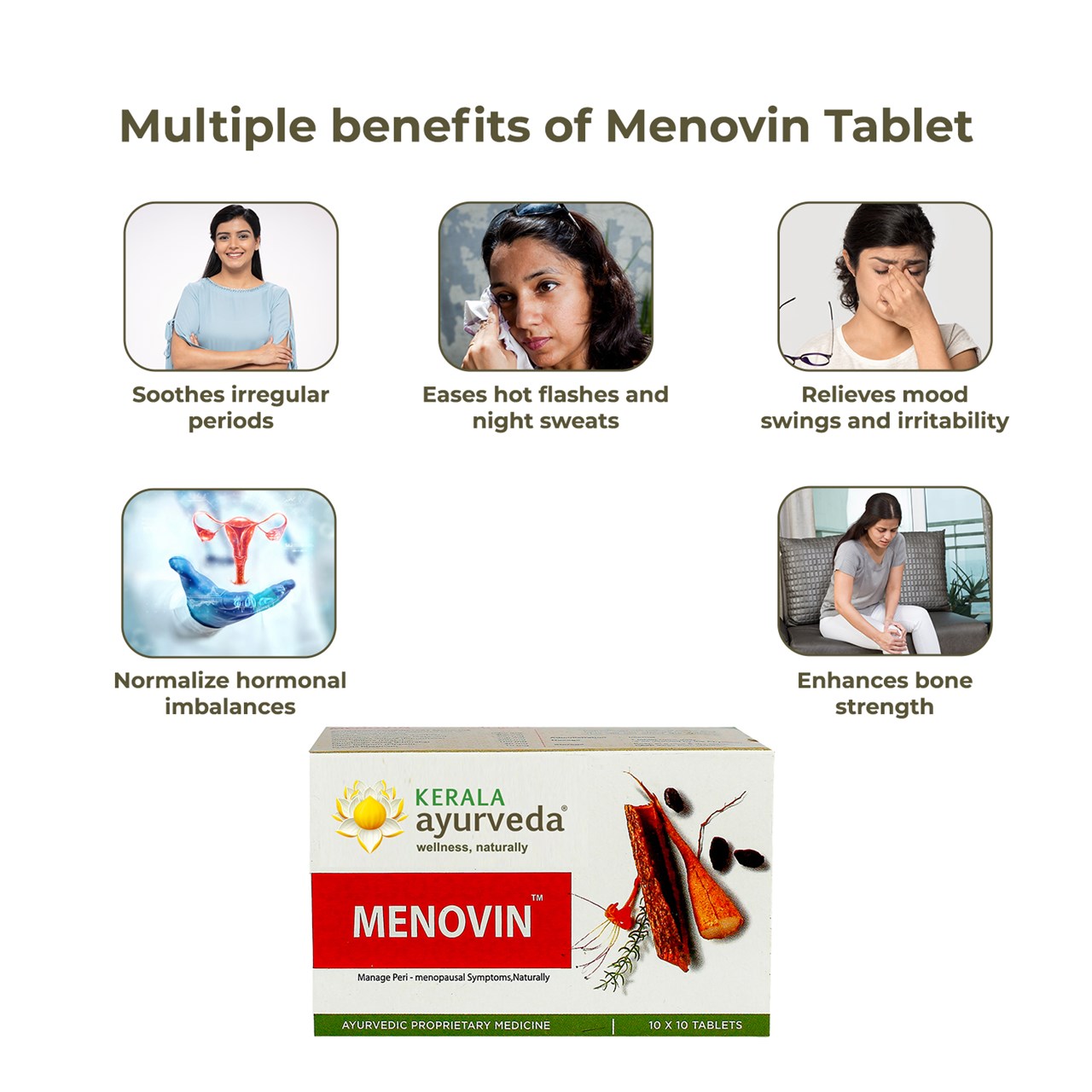 The Menovin tablet is an Ayurvedic formulation that uses traditional Ayurvedic herbs to help relieve symptoms during the transition that occurs before the actual permanent cessation of periods and the estrogen levels in a woman’s body start gradually falling. It can work as an Ayurvedic medicine for perimenopause. The natural ingredients in the Menovin tablet make it an Ayurvedic medicine for hormonal balance in females. The best part is that it is safe and prepared with natural ingredients. It is a safe Ayurvedic medicine for period regulation. Menovin tablet is an Ayurvedic medicine for middle-aged women that helps to balance hormonal fluctuations. By regulating hormonal levels in the body, it helps curb hot flashes and other hormonal issues.