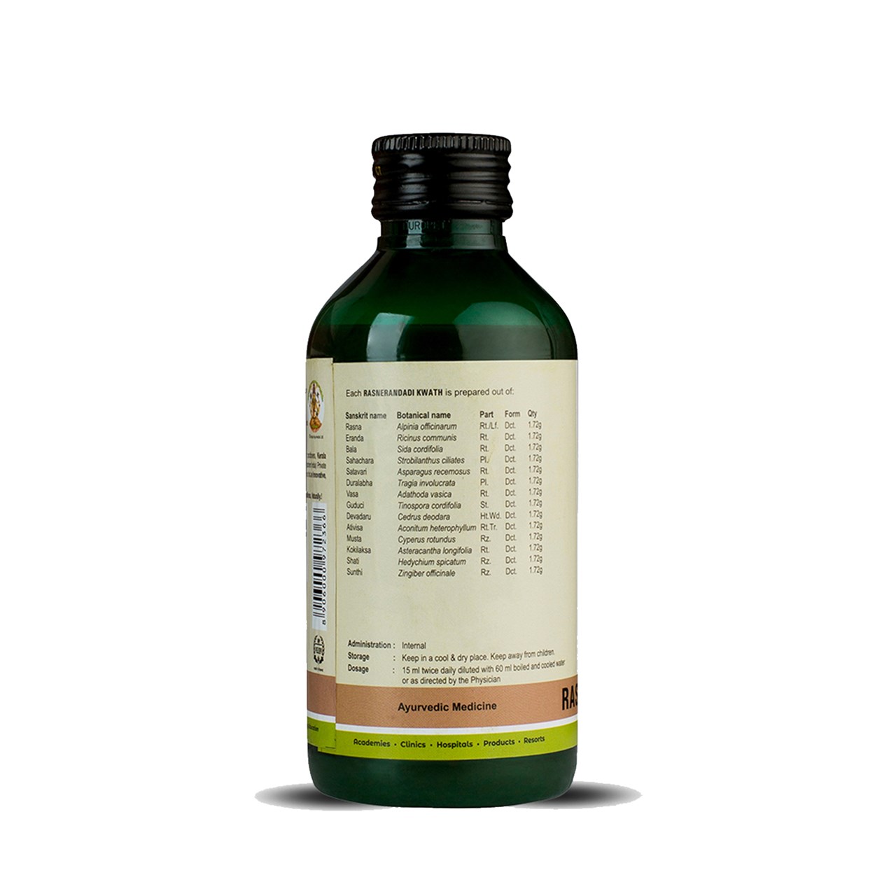 Shake the bottle well; mix 15 ml of Rasnerandadi Kwath with 60 ml of lukewarm water and take it twice daily before food or as directed by the physician. For better results, use consistently for 2-3 months. Seek advice from an Ayurveda doctor for long-term use.