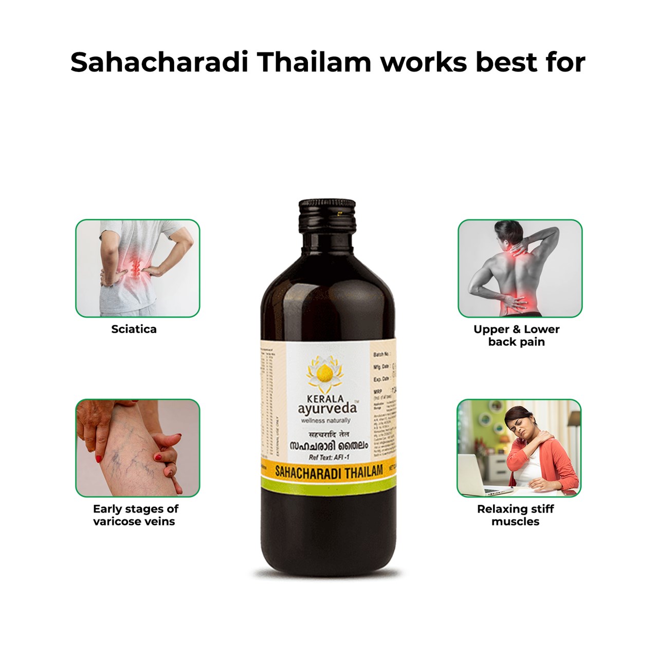 Kerala Ayurveda Sahacharadi Thailam be your ally in alleviating your back pain and sciatica. This oil is infused with the power of Sahachara, Dashamoola, Manjistha, Sesame oil, and Milk, easing your aches and strengthening the ligaments, muscles, and lower back bones. Reclaim your life and happiness - make Kerala Ayurveda Sahacharadi Thailam your companion on the road to wellness and experience a life free from pain and discomfort.