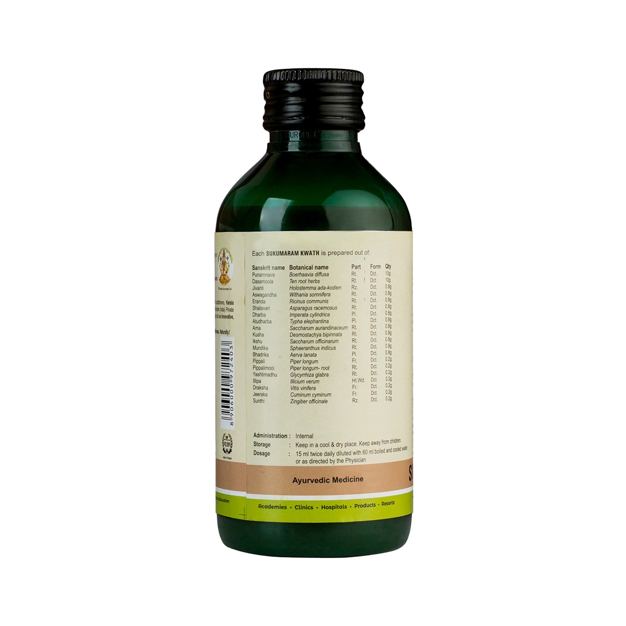Shake the bottle well. Add 15 ml of Sukumaram Kwath to 60 ml of lukewarm water, and mix. Drink this mixture twice daily before food or as directed by the physician.