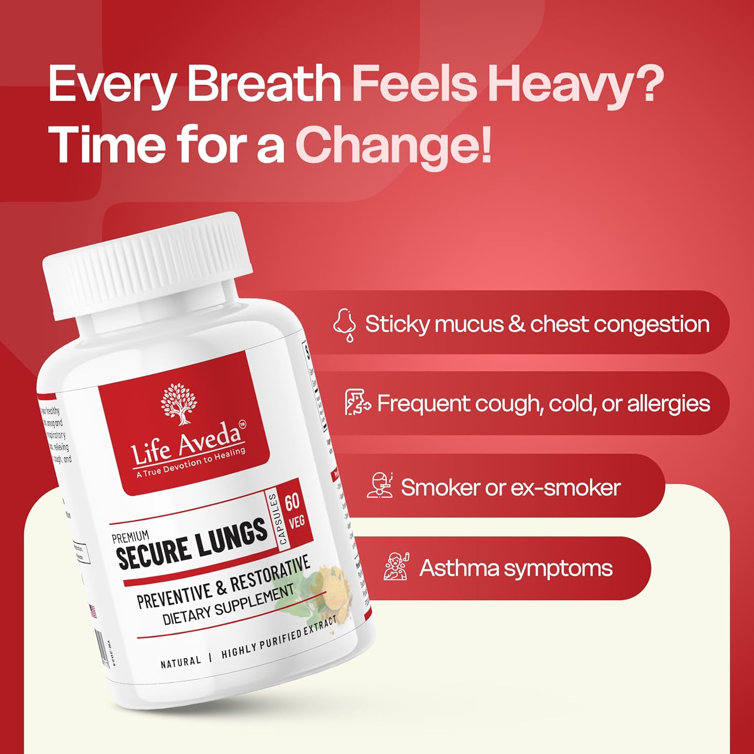 Secure Lungs is a carefully crafted Ayurvedic formulation that supports healthy lung function and aids natural respiratory comfort. It helps loosen and clear stubborn mucus, promotes smooth airflow by relaxing the air passages, and soothes throat and chest irritation caused by cough or congestion. With herbs like Vasaka, Tulsi, Mulethi, and Lungwort, it supports easier breathing, aids relief from seasonal discomforts like cold and allergies, and promotes long-term respiratory wellness.