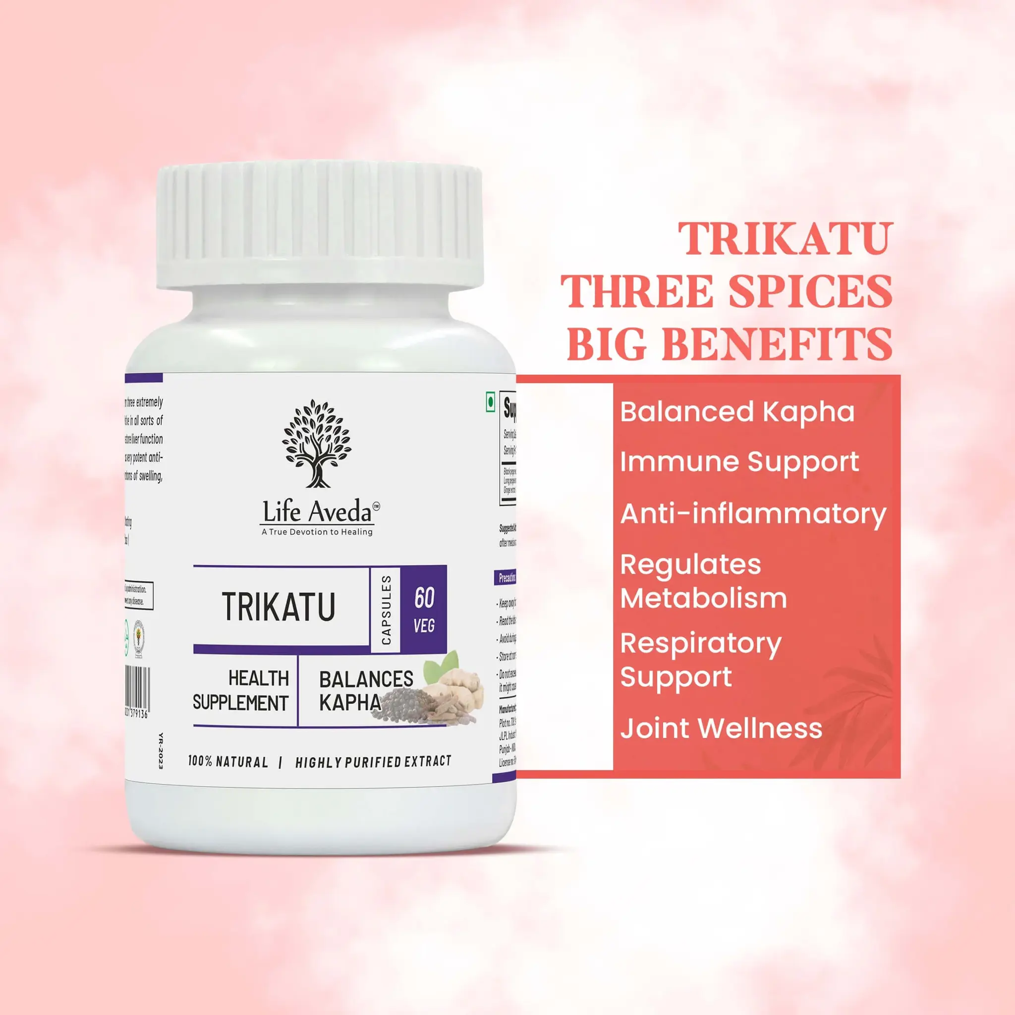 Trikatu is a traditional Ayurvedic blend of three herbs with rich anti-inflammatory properties that help to reduce pain and inflammation and promote overall respiratory health. It also aids in boosting immunity, increasing the metabolism rate and burning calories which may be helpful for weight loss.