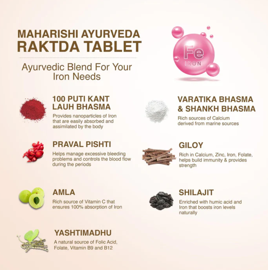 Maharishi Ayurveda Raktda is an Ayurvedic supplement that not only supplements iron but is also enriched with natural vitamin C, which improves the body's natural ability to absorb iron. It helps maintain optimum haemoglobin levels due to the presence of Kant Lauh Bhasma and iron oxide (Mandur Bhasma), which are easily absorbed and assimilated by the body. The remarkable aspect of our formulation lies in the process of Bhasma creation, which converts elemental iron, often toxic in its natural state, into an organic, readily bioavailable form. This transformation ensures that the iron is easily absorbed in the gut, enhancing its efficacy without any adverse side effects