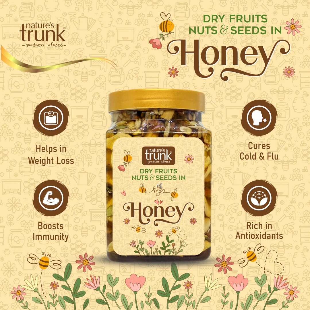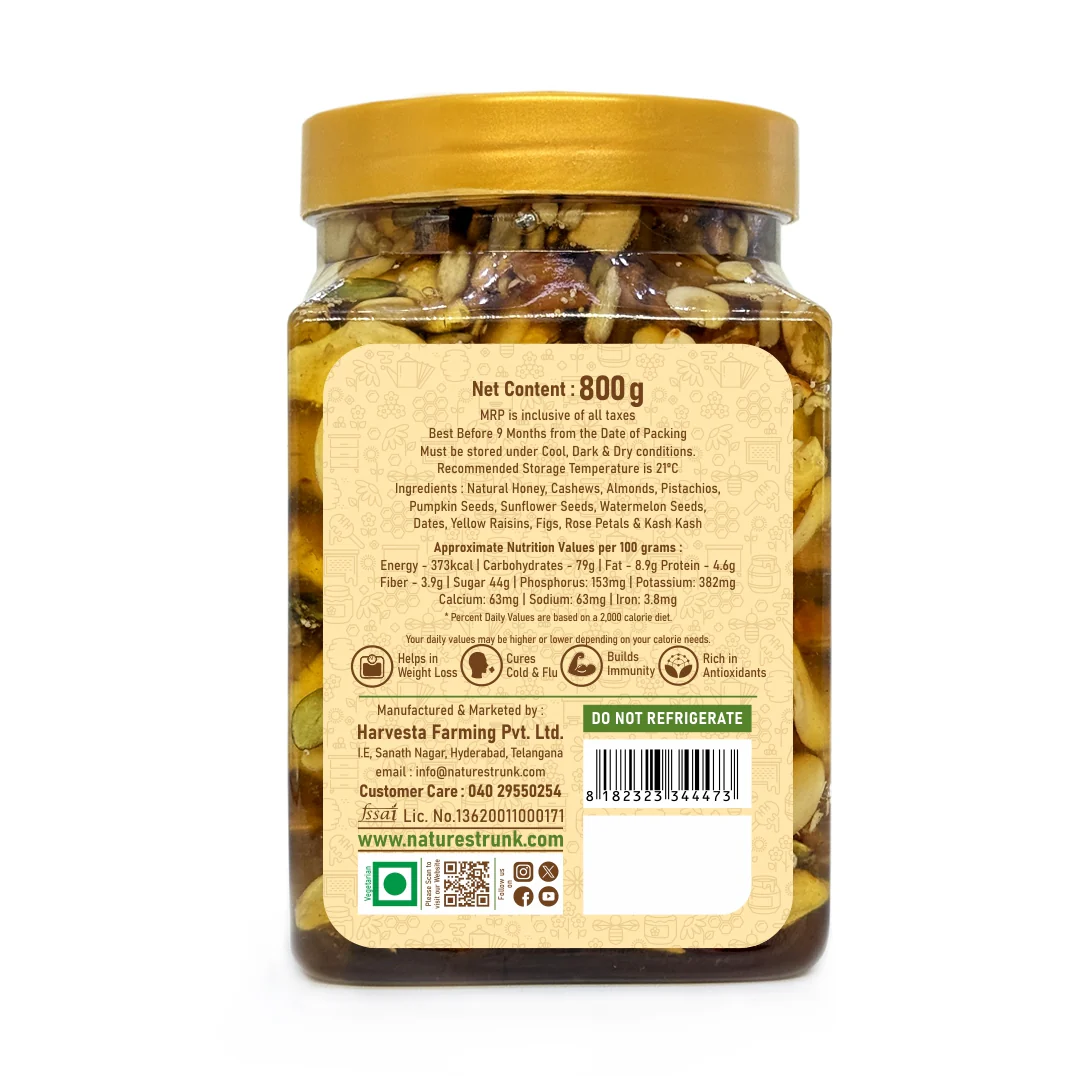 Perfect Packing: We carefully pack each jar of our Dry Fruits, Nuts & Seeds in Honey to keep it fresh and tasty. Sealed with care, our packaging ensures that you receive the product in its finest condition, ready to delight your taste buds.