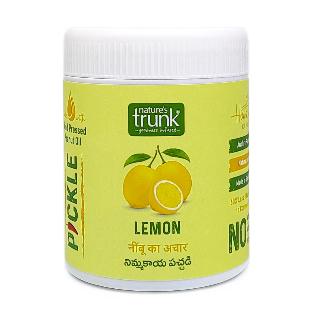 Lemon Pickle, made from select yellow lemons, wood-pressed peanut oil, and premium spices. small-batch crafted products with B-complex vitamins and Vitamin C to boost your health and immunity and Each jar embodies the essence of authenticity and quality, blending tradition with homemade goodness.