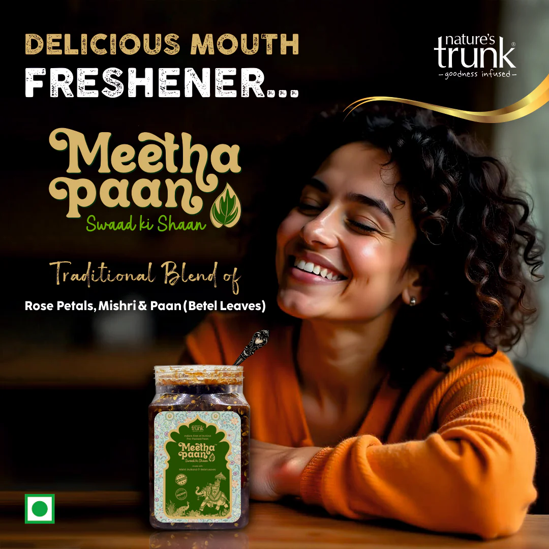 MeethaPaan is a traditional Indian delicacy that beautifully combines the freshness of betel leaves with the sweetness of gulkand, made from Damask rose petals. This unique treat features a harmonious blend of mishri (rock sugar), fennel seeds, watermelon seeds, natural honey, cow ghee, cardamom, and menthol, creating an irresistible flavour profile that tantalizes the senses. Each bite offers a refreshing and aromatic experience, making it an ideal after-meal indulgence or a delightful snack any day.