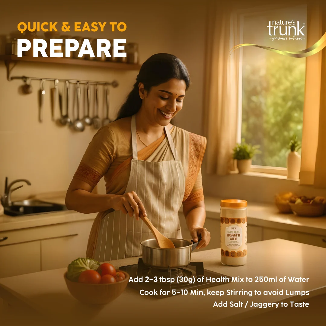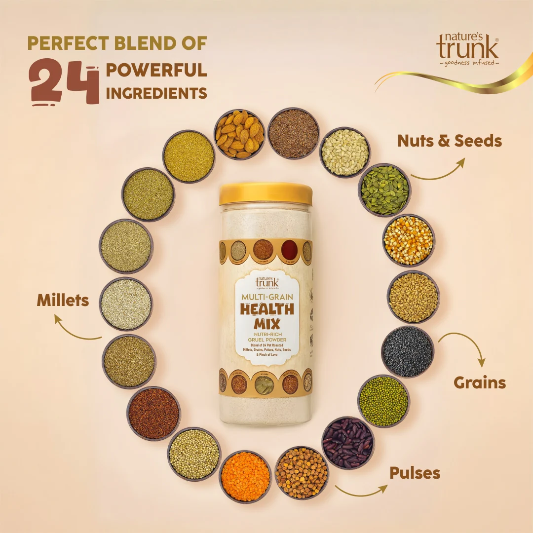 Multi-Grain Health Mix, is a meticulously crafted blend of 24 nutrient-rich ingredients including Millets, Grains, Pulses, Nuts & Cereals that encompass proteins, fiber, antioxidants, healthy fats, and complex carbs. This Gruel Mix is designed to complement a balanced diet, promoting optimal body function and supporting a healthy lifestyle. With a focus on high protein and fiber content, while keeping fats low, it ensures sustained energy release, contributing to a feeling of fullness and aiding in digestion. Health Mix stands out as a versatile and beneficial dietary supplement, especially during growth stages, offering a variety of nutrients essential for overall health and wellness.