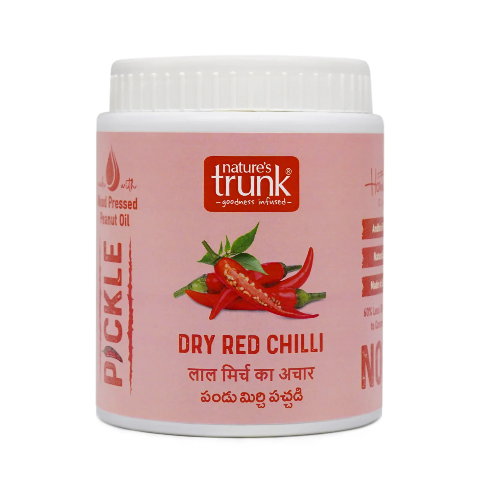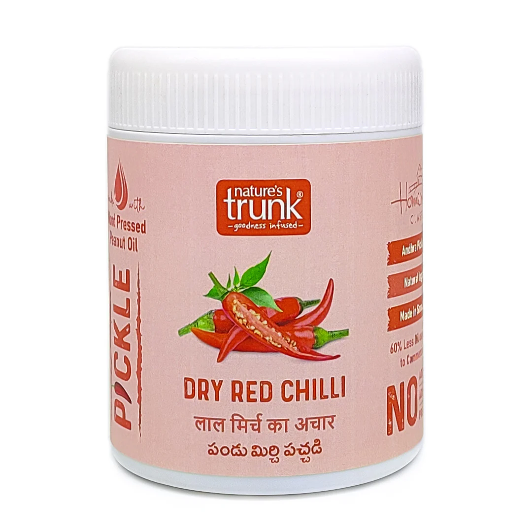 Spicy and aromatic Red Chilli Pickle made with care from fresh, fine-grade red chillies, naturally cultivated and blended with wood-pressed peanut oil and premium spices. Produced in small batches for taste and freshness, and ensure a longer shelf life. Experience homemade goodness, free from preservatives, in every hygienically sealed bottle.
