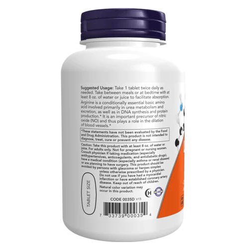 Arginine is a conditionally essential basic amino acid involved primarily in urea metabolism and excretion, as well as in DNA synthesis and protein production.* It is an important precursor of nitric oxide (NO) and thus plays a role in the dilation of blood vessels.* This product has twice the L-Arginine (1,000 mg per tablet) as in our regular strength product (500 mg per capsule). The L-Arginine used in this product is pharmaceutical grade. Natural color variation may occur in this product.