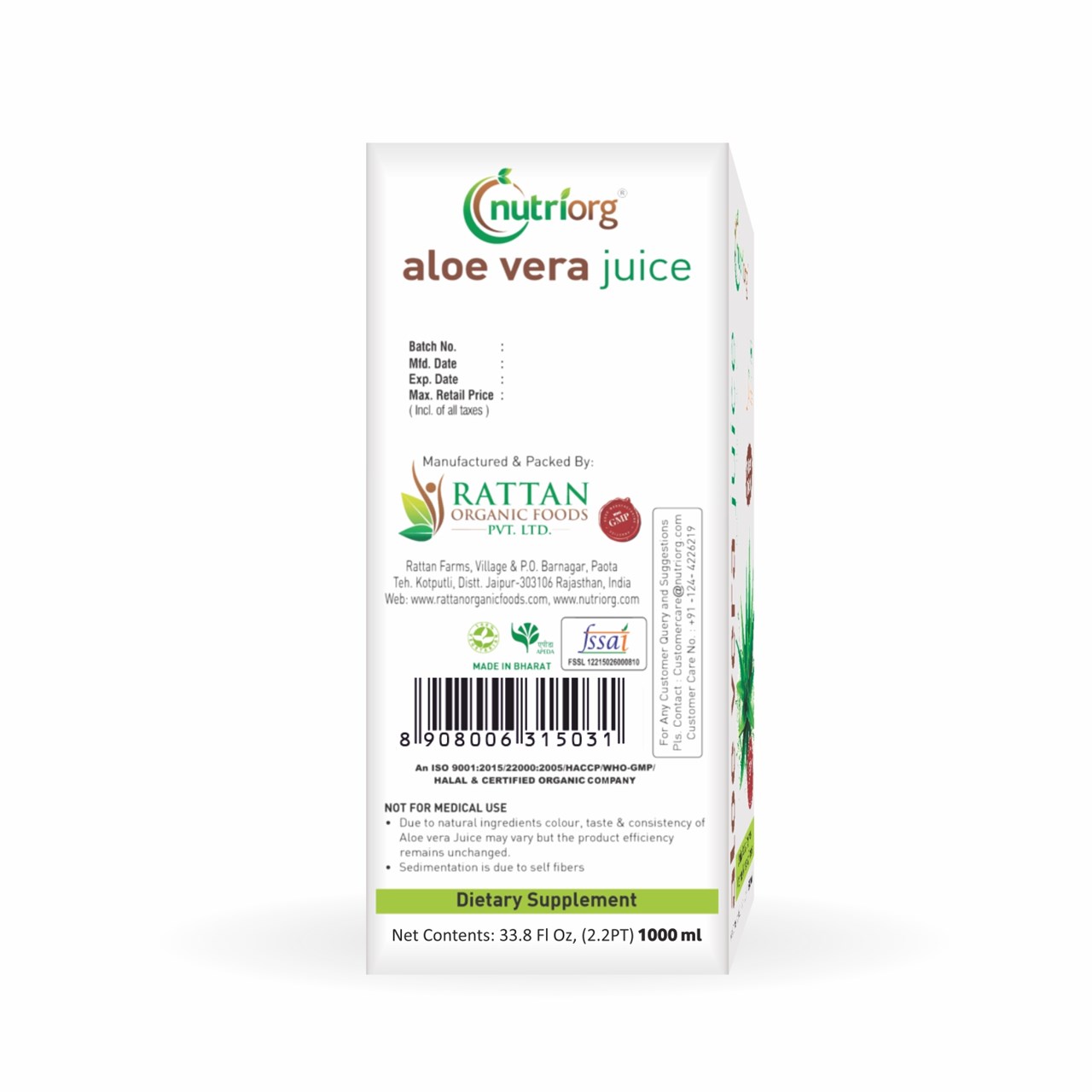 Aloe Vera is a multifaceted medicinal plant. The plethora of values and qualities that an Aloe Vera plant possesses can remotely be compared to any other plant or herb. In the world of Ayurveda it has earned the title of the silent healer and finds numerous mentions in the Ramayana, the Bible and the Vedas. It is known for the regulation of metabolism as it contains various enzymes which help in the digestion of carbohydrates, proteins and fats. Aloe vera is rich in B12 which is usually solely present in animal sources, thus acts as a good source for vegetarians and vegans. It prevents dehydration of the body. The Nutriorg Aloe vera Juice heals wounds and cuts and is beneficial for a healthy skin. The Aloe Vera plant has a history of over 5000 years; people have used it for various medicinal purposes in the past. From Queen of Egypt Cleopatra to Mahatma Gandhi everyone has preached its health benefits. No doctor can overlook the medicinal values that the Aloe Vera plant embodies.• The Nutriorg Aloe vera Juice works wonders for aiding the decline in the glucose levels in the blood.• It helps in metabolism and detoxification.• Aloe vera checks constipation as it works as a laxative• Aloe vera is power packed with nutrients as it is a powerhouse of Vitamins C, E and Beta Carotenes and traces of B12. Minerals like sodium, potassium, magnesium, copper and zincet care also present which are required for the body for building a healthy foundation• It helps elevate constipation, obesity, back pain.•Mix 15-20 ml of Nutriorg Aloevera Juice in 200 ml of lukewarm water in a non-metallic pot and consume empty stomach twice a day preferably morning and evening.Organic Alovera