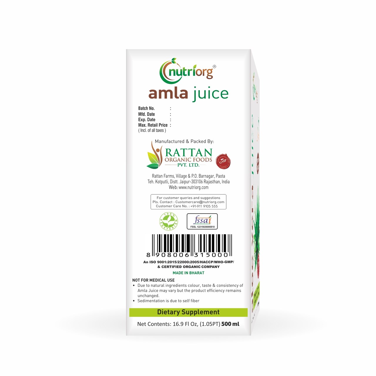 Nutriorg Amla Juice is made from Organic Amla, cultivated in the company's certified organic farmland situated in Rajasthan. Nutriorg Amla Juice is 100% pure and unadulterated. Amla is the richest source of vitamin C. It also helps in improving the efficacy of other vitamins in the body. Amla is also known to improve vitality. Amla is considered the most potent herb to manage overall health and well being.