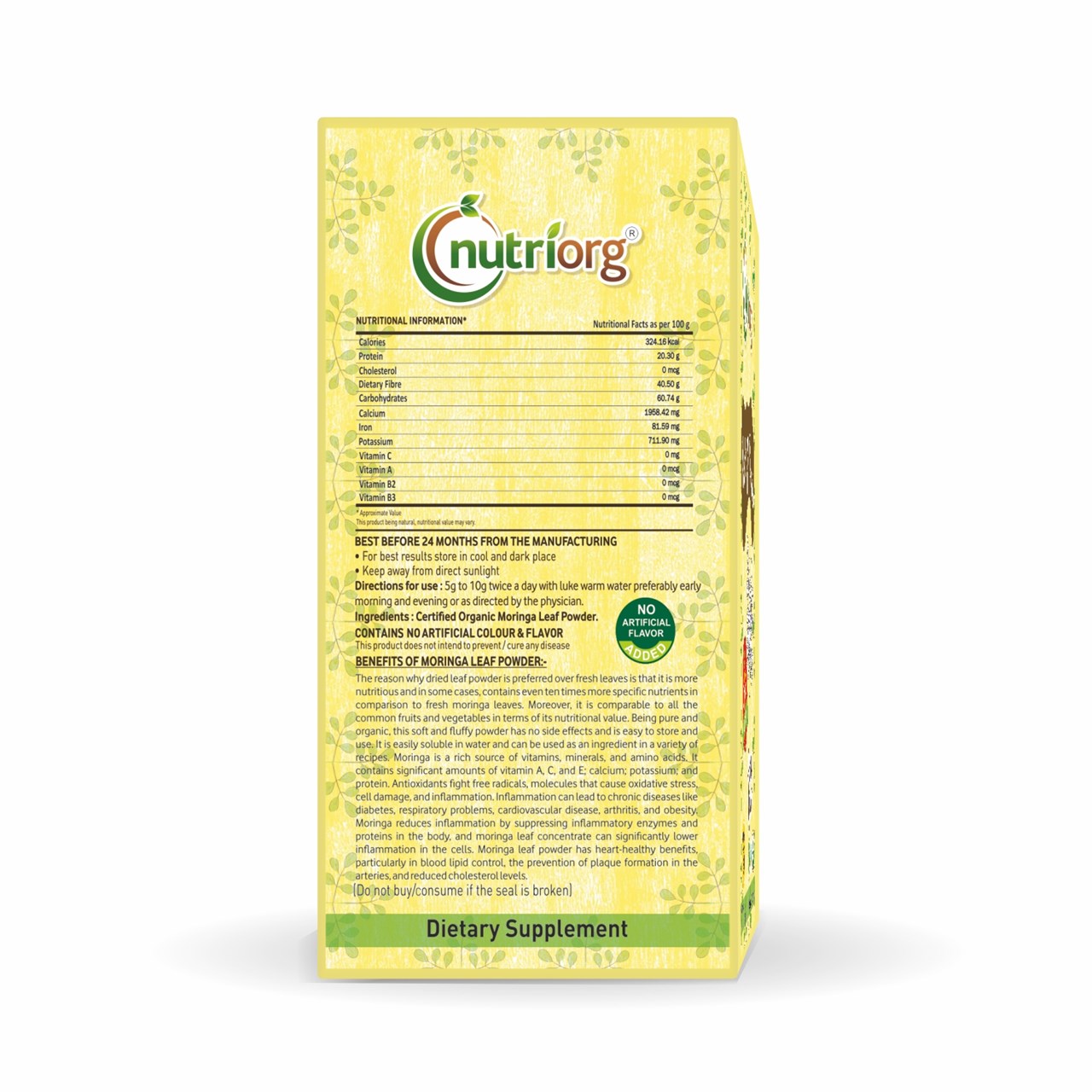 Nutriorg Certified Organic Moringa Powder is made from moringa leaf cultivated in certified organic farmlands. It is an excellent source of vitamin A, vitamin C, vitamin E, and bioflavonoids. These nutrients help in blocking the oxidation of healthy tissues by active oxygen, thus delaying the ageing process and reducing the appearance of fine lines and wrinkles. Moringa powder contains all the essential nutrients, vitamins, and minerals conducive to healthy hair. It is loaded with high contents of vitamins E and C.