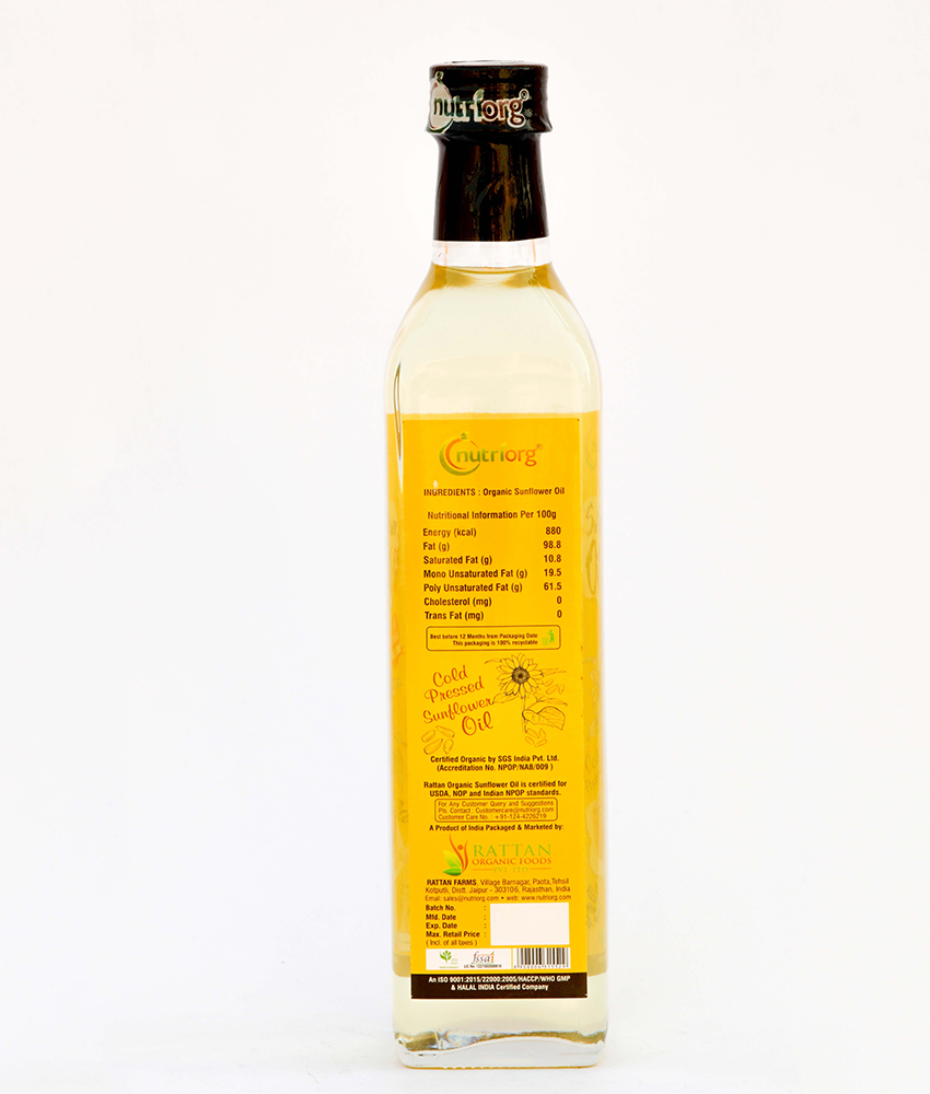 Nutriorg brings certified organic sunflower oil that is hygienically extracted from organically grown and cultivated sunflower. It has added advantages for your health since it is multi-faceted oil and is organically grown. Sunflower oil is considered an all-purpose cooking oil. Sunflower oil is a light, vegetable-based oil that's high in vitamin E and can be used as a moisturizer. It's also great for cooking since it doesn't burn easily and has a mild flavor. It's also rich in omega-6 fatty acids, which can help you maintain a healthy weight and reduce inflammation in the body.