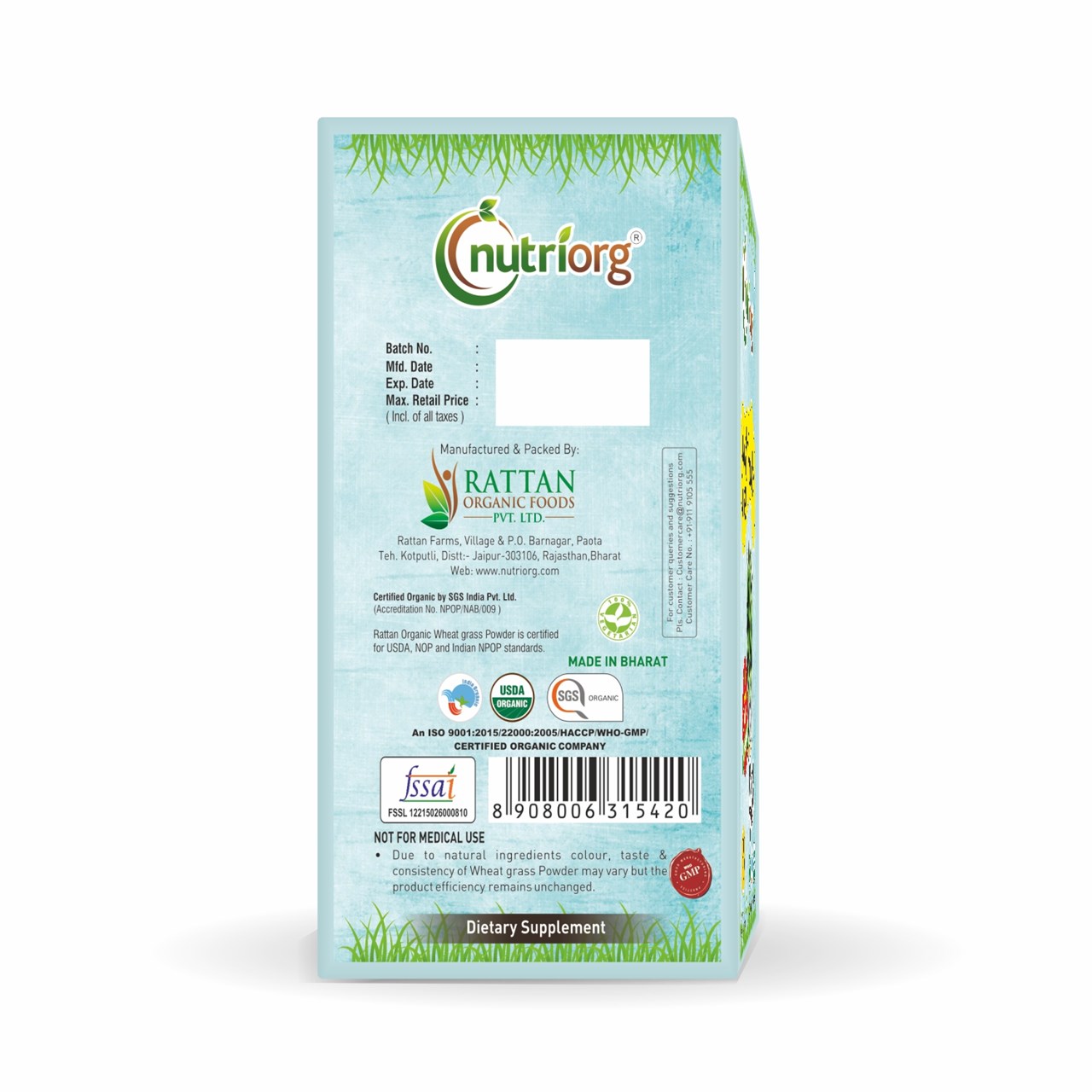 Nutriorg certified organic wheat grass powder is made from certified organic wheat grass cultivated in certified organic farmland. Nutriorg Wheat Grass Powder is a certified organic powder. The primary reason for the numerous health benefits of the Nutriorg certified organic Wheat Grass Powder is its concentrated Chlorophyll content (about 70%) in addition to the 98 earth elements it contains including Calcium, Iron, Phosphorus, Magnesium and Potassium. It is also rich in essential enzymes. The best trait being that unlike wheat, wheat grass powder is gluten free. Nutriorg Certified Organic Wheat Grass Powder contains all the properties of the Wheat Grass plant including nutrients, Vitamins and minerals in a perfect balance. Nutriorg Certified Organic Wheatgrass Powder can be mixed in water to make a nutritional drink and can even be added to juices and smoothies