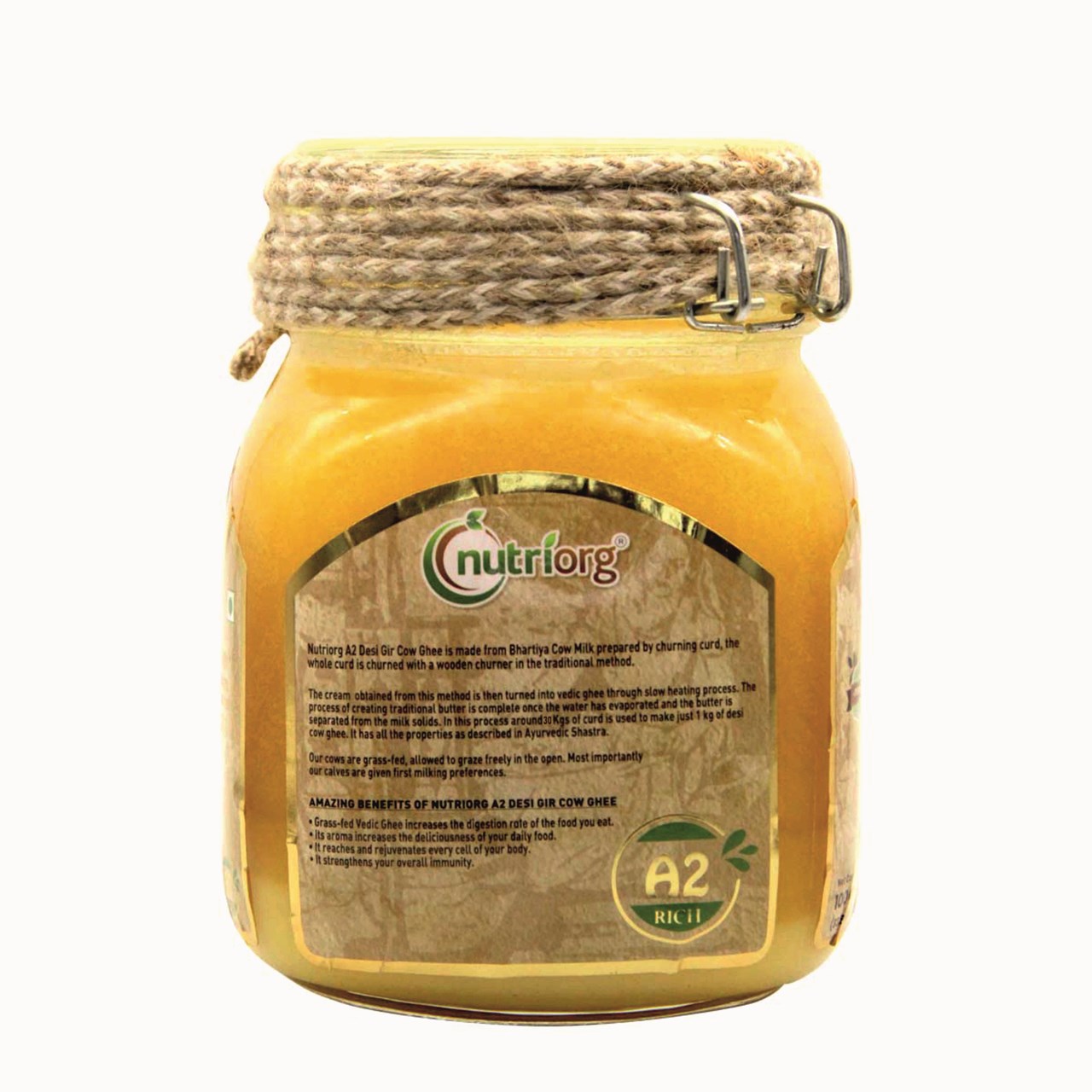 Nutriorg Pure Desi Gir Cow Ghee is made from desi cow milk that comes directly from our own grass-fed cows. Their calves are given first milking preferences, and the milk gathered afterward is boiled to make curds—which then go into making your favorite gourmet foods! The whole curd is churned using a wooden churner, resulting in butter, then heated slowly to create Vedic ghee. To make traditional ghee, butter is separated from the milk solids once all of the water has evaporated. The Nutriorg Desi Gir Cow Ghee is hugely beneficial for the entire body. Consumption of ghee offers a wide range of benefits, including clarity of mind and improves immunity. Because of its high smoke point (250C or 482F), ghee is one of the best to use in cooking since it doesn’t break down into free radicals like others It aids weight loss as the type of saturated fat that Desi Gir Cow Ghee has is a short-chain fatty acid. This helps to burn the stubborn fat in the body while regulating your metabolism. The Gir Cow Ghee balances your hormones. The fat content in the body is mostly saturated fat and only 3% is of other types. This ratio is absolutely important to know for good health and well-being. The Nutriorg Desi Gir Cow Ghee is rich in Vitamin K2 which builds hormones along with Vitamin A, D, E & K. 3. It is proven to be good for the heart. Vitamin K2 found in Desi Gir Cow Ghee helps in preventing calcium deposits in the arteries that can lead to blockages and obstruction of blood flow. It lowers bad cholesterol levels and increases good cholesterol levels, thus maintaining a healthy balance.