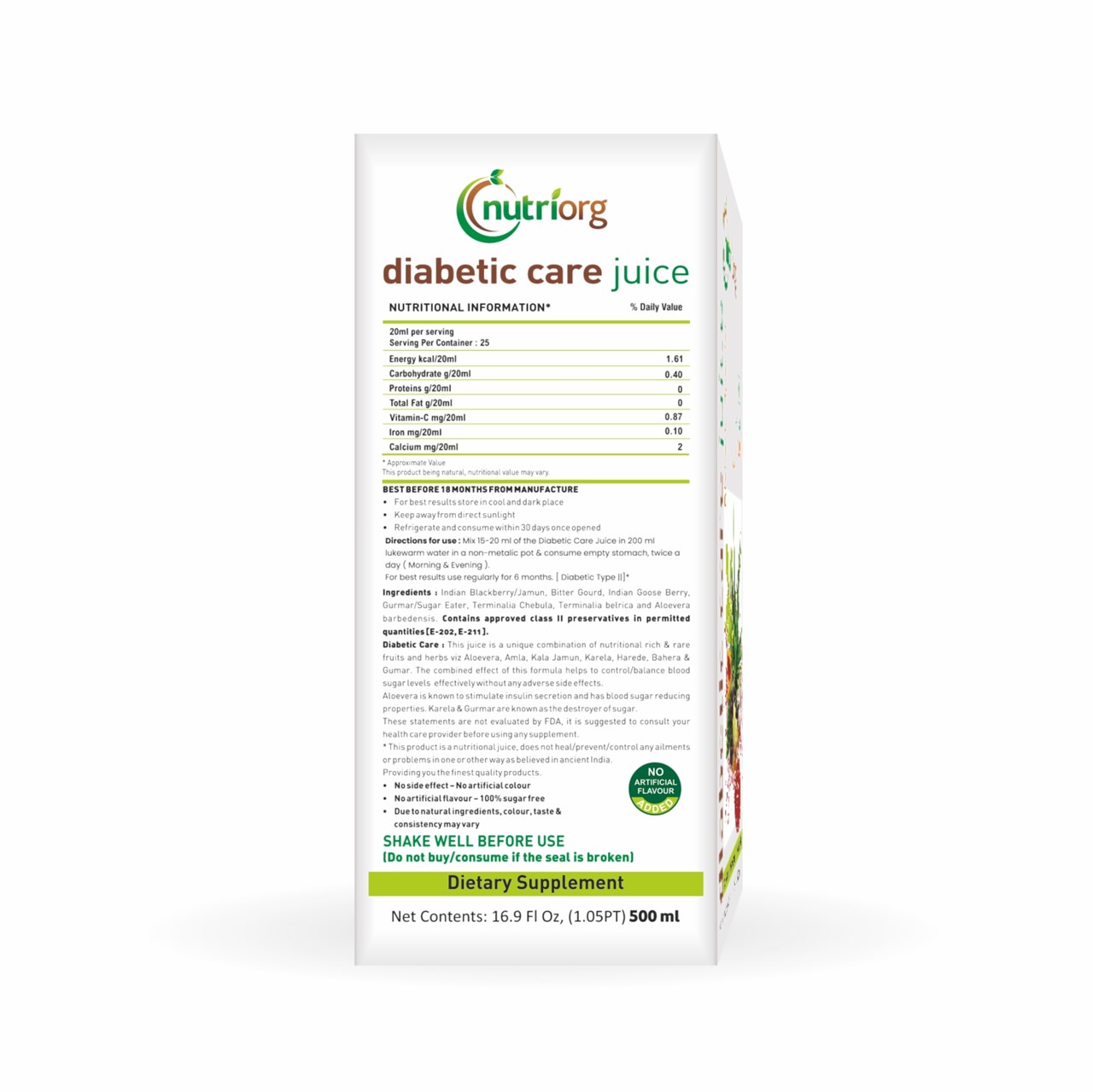 Nutriorg Diabetic Care Juice is a unique combination of Bitter Gourd (karela), Indian Blackberry(Jamun), Harad,Amla,Baheda, GymnemaSylvestre(Gurmar) and Aloe vera Juice. Karela and Gurmar are known as a destroyer of sugar. A combined effect of this formula helps to maintain a healthy system.• Nutriorg Diabetic Care Juice is a unique combination of Bitter Gourd (karela), Black Plum(Jamun), Harad,Indian Gooseberry(amla),Baheda, GymnemaSylvestre(Gurmar) and Aloevera Juice.• Karela from ancient times has been used for lowering glucose levels in the blood; along with Gurmar which has the tenacity to reduce sugar cravings and when taken along with medication helps to reduce sugar levels in the blood.• It also helps in weight loss and strengthening of immunity.• Great for your eyes• Karela juice provides ample amounts of vitamin C, an antioxidant that plays a role in promoting immunity•Mix 15-20 ml of Nutriorg Diabetic Care Juice in 200 ml of lukewarm water in a non-metallic pot and consume empty stomach twice a day preferably morning and evening.Bitter Gourd (karela), Indian Blackberry (Jamun), Harad, Amla, Baheda, Gymnema Sylvestre (Gurmar) and Aloe vera