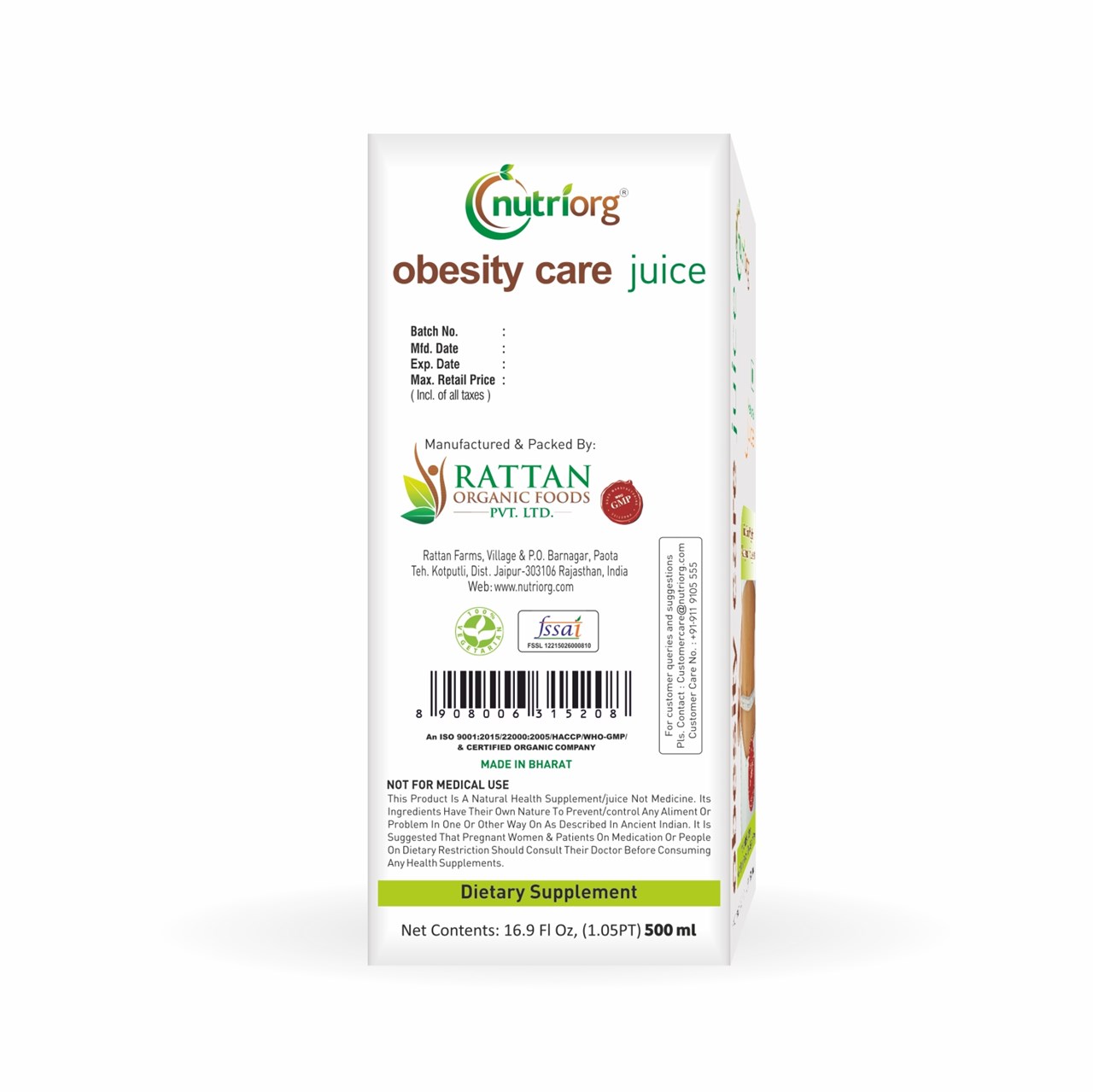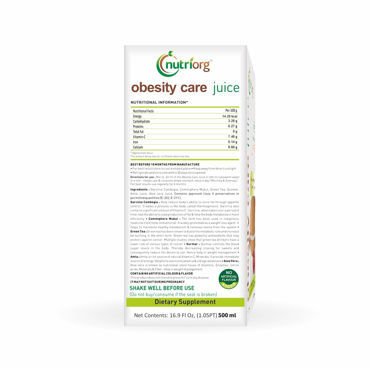 The main ingredients in nutriorg Obesity care juice are Green Tea, Garcinia, Commiphora Mukul,Gurmar (Gymnemasylvestre), Amla and Aloevera juice. Nutriorg Obesity Care Juice is a carefully selected unique combination of herbs and ingredients which are found to be clinically proven in weight loss.Nutriorg Obesity care juice provide complete weight control package which is helpful in controlling weight. It also helps in excess fat reduction. Nutriorg Obesity Care Juice not only improves your digestion but helps in flushing out dangerous toxins from your body. Try this package for a month and you will find yourself much fitter and energetic.• Garcinia Cambogia helps reduce the body's ability to store fat through appetite control. It also contains a significant amount of Vitamin C. Garcinia, when taken over a period of time, has the ability to slow production of fat & help the body metabolize it more efficiently.• Commiphora Mukul has been used as an indigenous medicine since time immemorial. It is widely promoted as a weight loss agent. It helps to maintains healthy metabolism & removes toxins from the system.• Green Teais proven to boost the metabolic rate and enhance fat burning in a short period. Green tea possesses powerful antioxidants.• Gurmar (Gymnemasylvestre) controls the blood sugar levels in the body thereby decreasing cravings for sweets and consequently reduces appetite. Hence aids in weight management.• Amla is a rich source of natural Vitamin C and Minerals. It acts as an immediate source of energy.•Mix 15-20 ml of Nutriorg Obesity Care Juice in 200 ml of lukewarm water in a non-metallic pot and consume empty stomach twice a day preferably morning and evening.Green tea, garcinia, commiphora mukul,Gurmar (Gymnema sylvestre), amla and aloevera