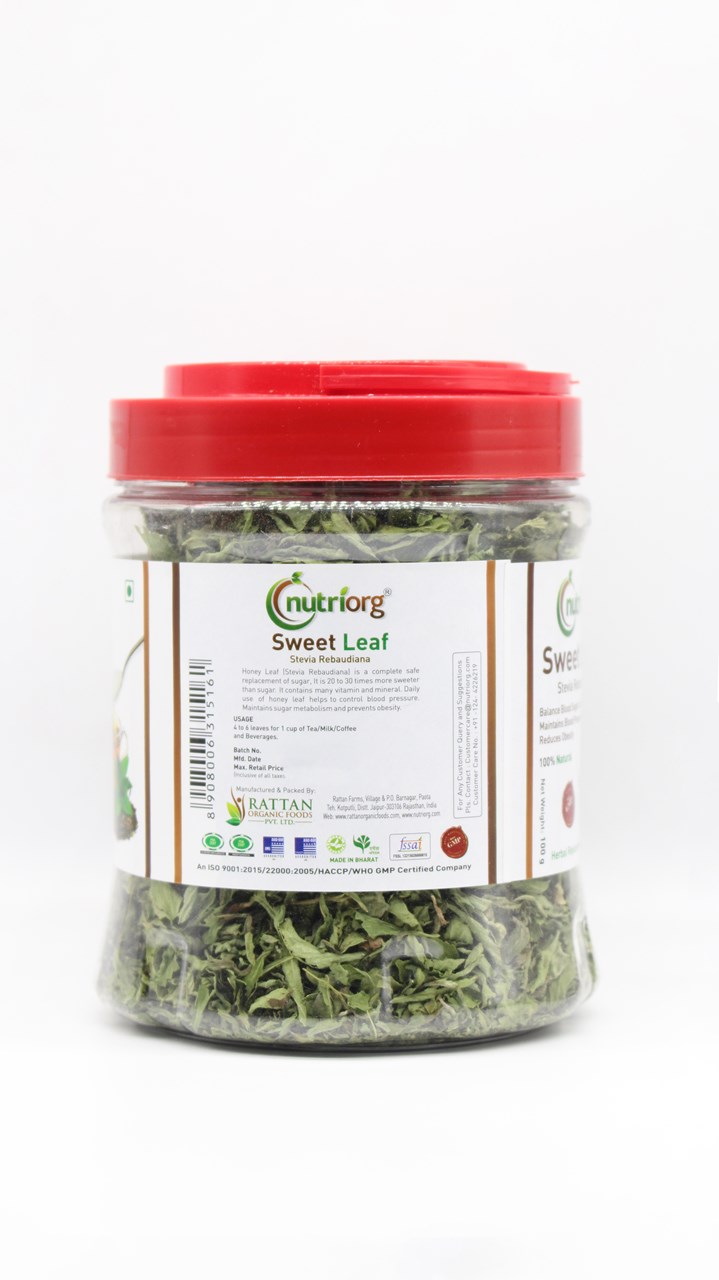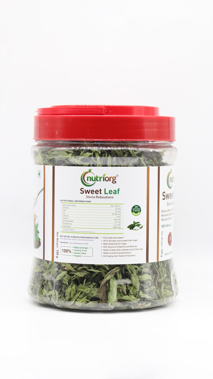 - Nutriorg Organic Stevia leaf is a great replacement of Sugar, Nutriorg Organic Stevia Leaf are 200 times sweeter than sugar.