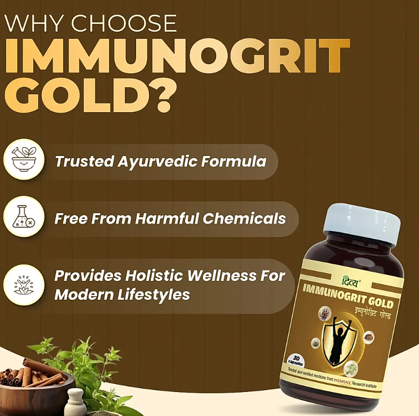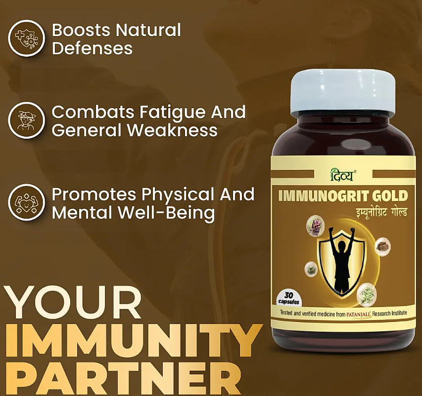 Discover the power of Ayurveda with Divya Immunogrit Gold Capsule, a unique blend of traditional Ayurvedic ingredients and modern science to enhance your immune system and overall well-being. Infused with the goodness of gold bhasma and potent herbs, this supplement is designed to protect your body from illnesses, promote vitality, and help you maintain a healthy, active lifestyle. Whether you're battling seasonal changes, feeling fatigued, or seeking to improve your health holistically, Divya Immunogrit Gold Capsule is the perfect addition to your daily routine. Each capsule is crafted to deliver maximum potency, ensuring your body gets the care it deserves. Patanjali Divya Immunogrit Gold Capsule is a specially formulated Ayurvedic supplement designed to boost immunity, improve vitality, and promote overall well-being. Crafted using a blend of time-tested Ayurvedic herbs and gold bhasma, this unique capsule combines ancient wisdom with modern wellness to strengthen your body's natural defense system.