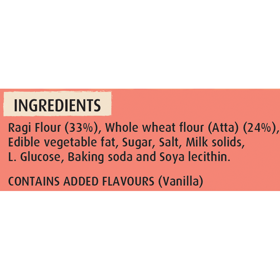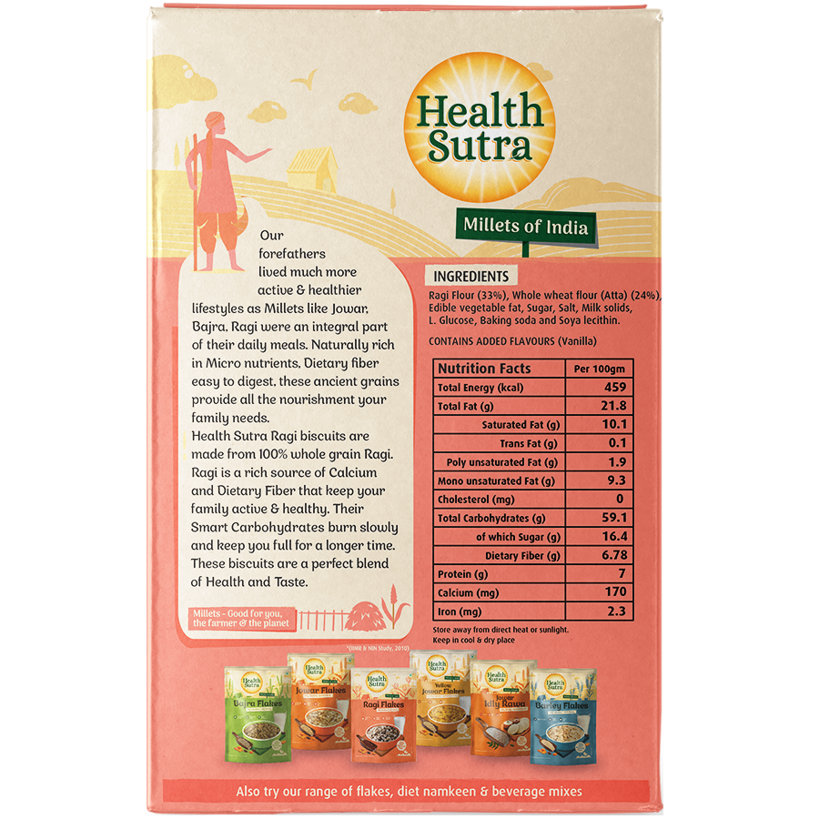 These high-fiber digestive biscuits are made from 100% whole grain Ragi. Ragi is a rich source of antioxidants and calcium which helps in strengthening bones and offers overall well-being. Complex carbohydrates in Ragi keep you filled up for a longer period throughout the day and also help you fight health conditions like Diabetes. These biscuits are a healthy option for you to satisfy your hunger with great taste without compromising on your nutritional needs Enjoy a tasty wholesome biscuit in snack packs of 2 biscuits each